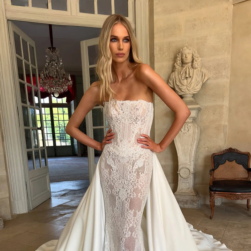 Elegant Strapless Beaded Corset Lace Mermaid Wedding Dress with Overskirt SW218