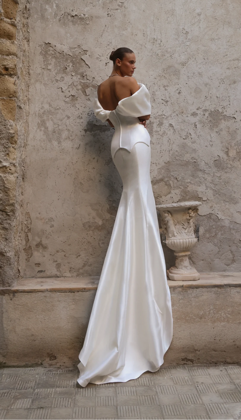 Luxury Satin Off-the-Shoulder Puff Sleeve Mermaid Wedding Dress SW178