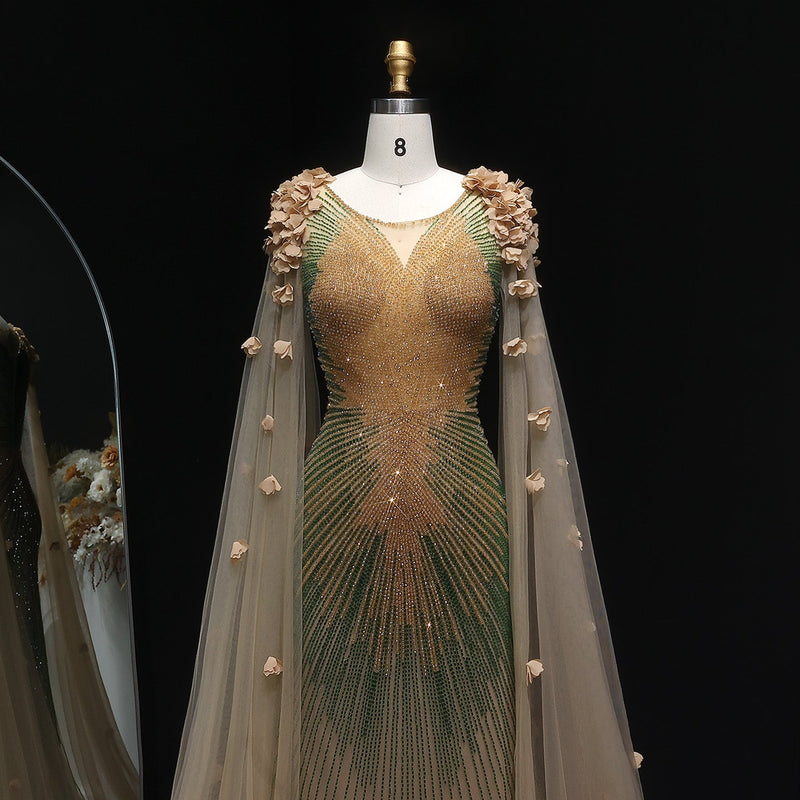 Luxury Aqua Ruffled Cape Crystal Sequin Evening Dress SS410