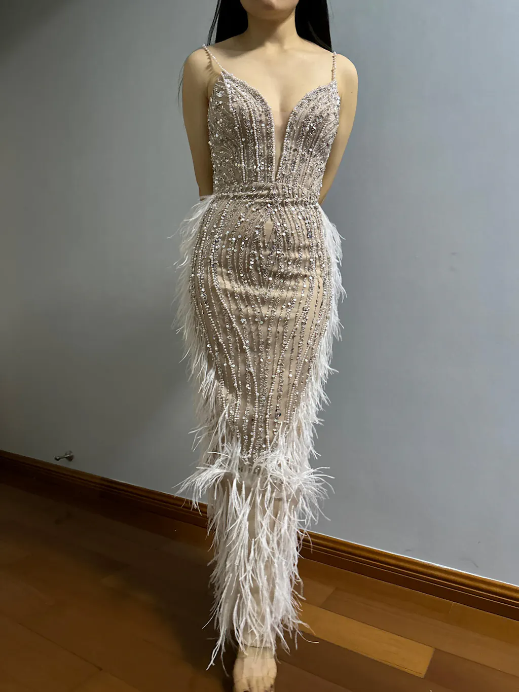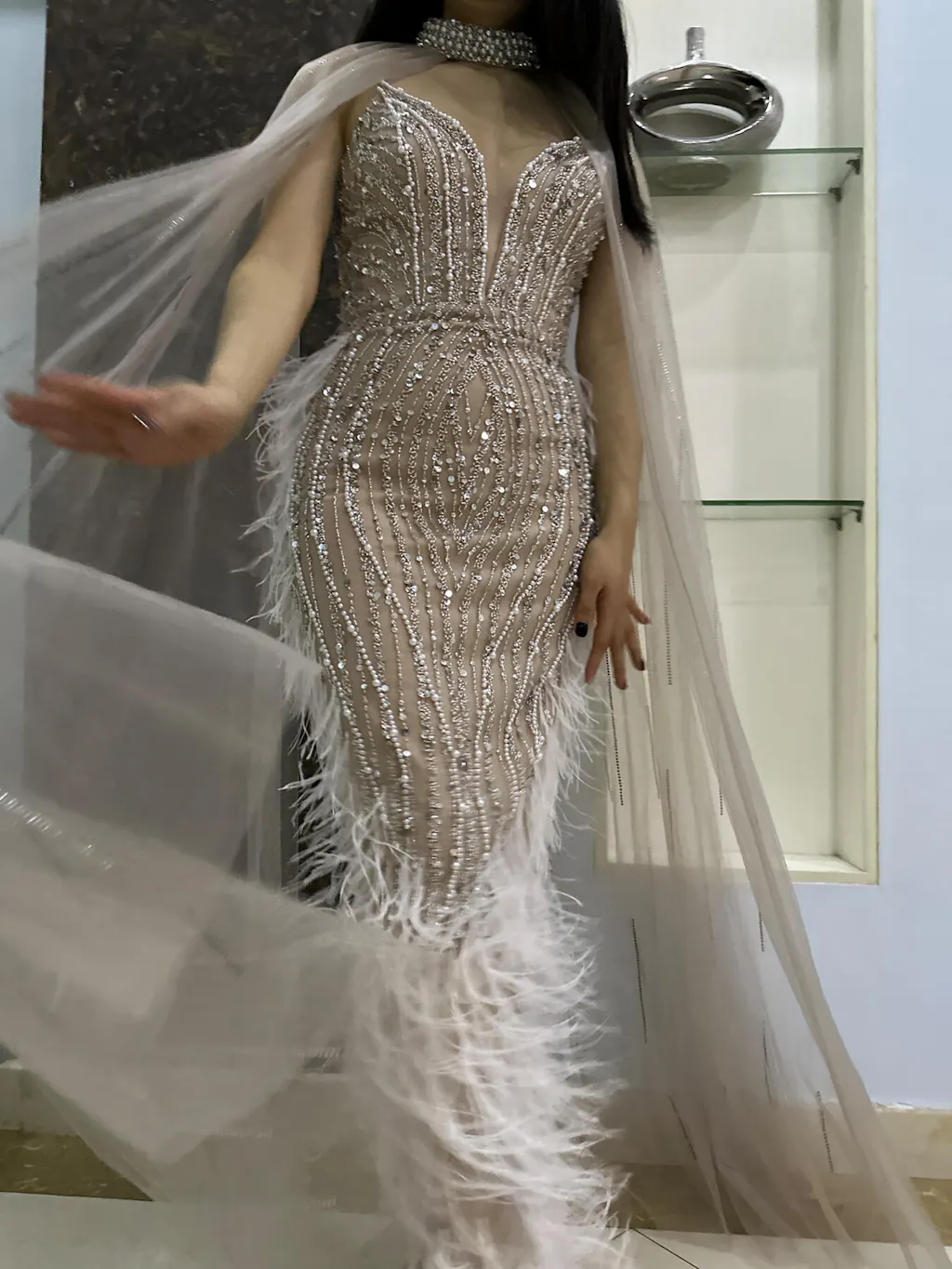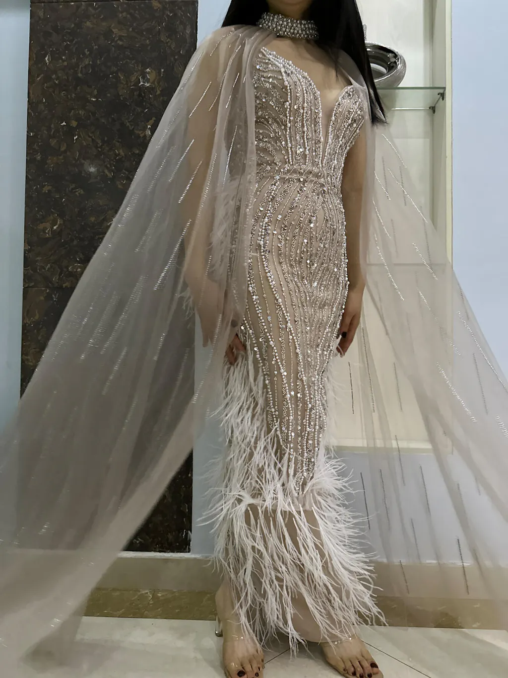 فستان سهرة فاخر من الريش العاري بتصميم حورية البحر مع عباءة SS185