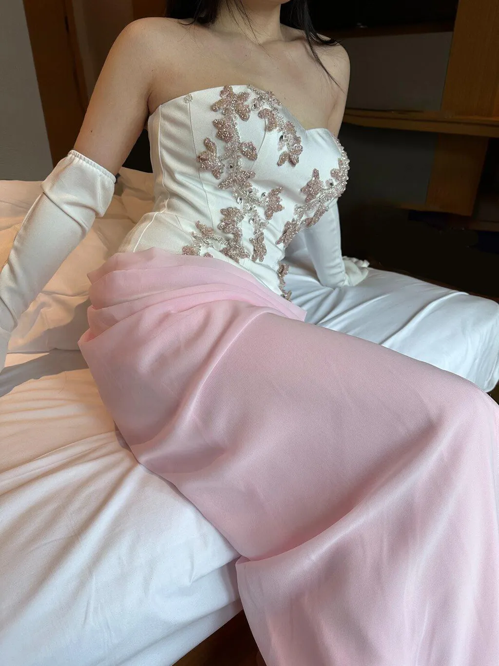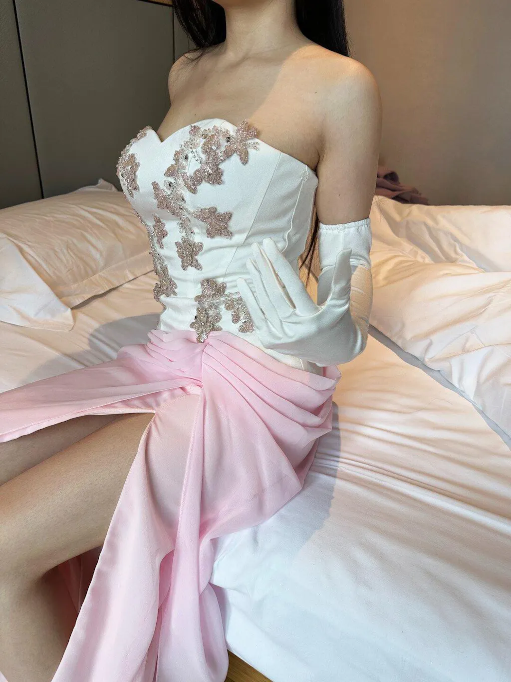 Elevate your evening elegance with this strapless pink dress adorned with delicate 3D floral appliqués. Its graceful silhouette enhances your figure while the soft pink hue adds a touch of romantic sophistication. Perfect for special occasions, this dress blends timeless charm with modern details for a refined, unforgettable look.