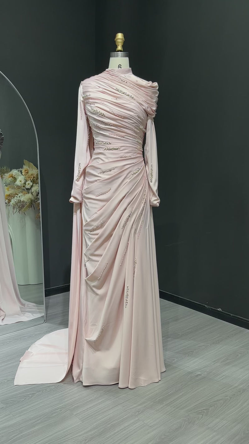 Elegant Pink Mermaid Beaded Evening Dress with cap and ruffles SS412