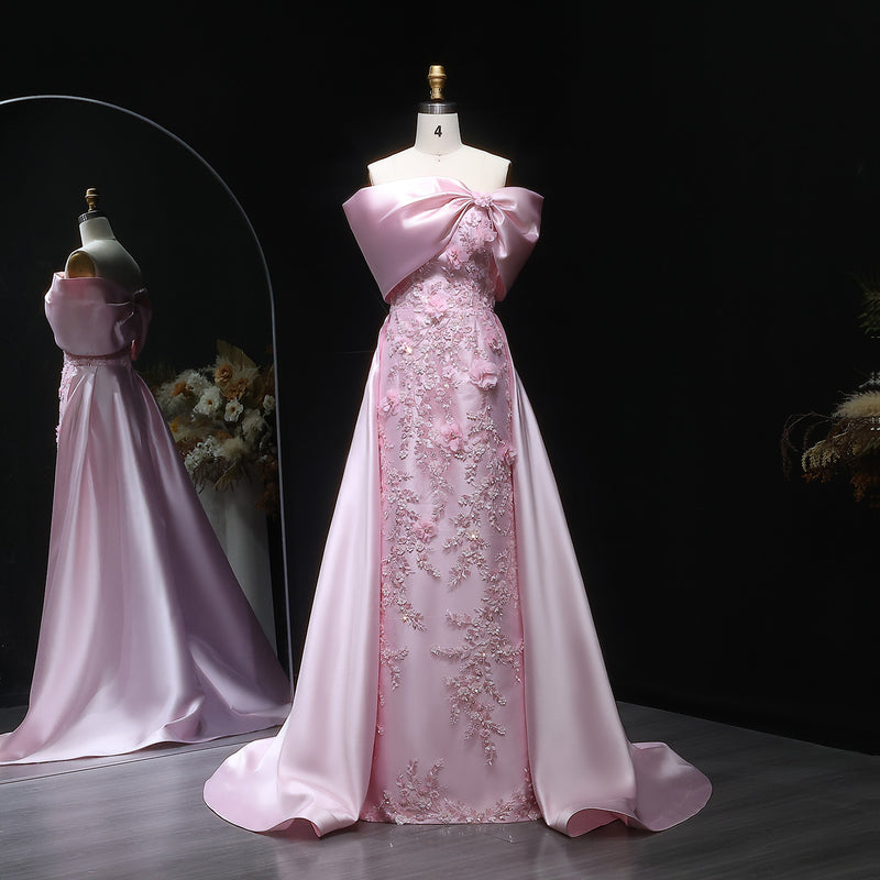 Luxury Pink 3D Floral Sequin Bow Satin Evening Dress XD056