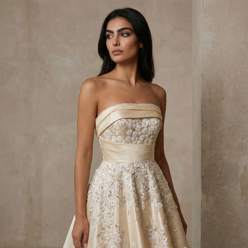 Elegant Light Yellow 3D Floral Strapless Evening Dress with Overskirt SS654