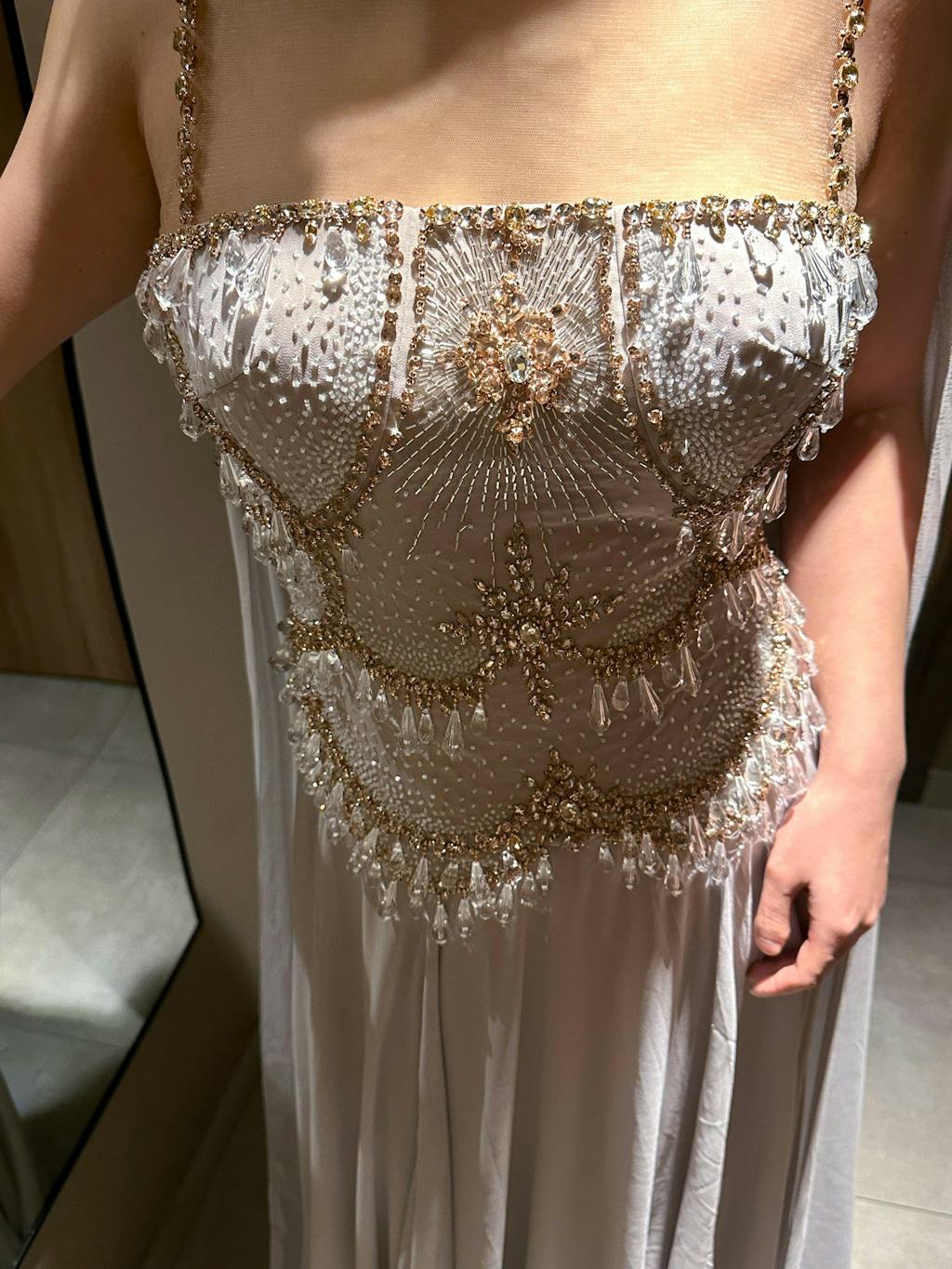 Elevate your evening elegance with this stunning dress, featuring a harmonious blend of silver and gold tones that catch the light beautifully. Adorned with large crystals that create a luxurious, eye-catching sparkle, this gown exudes refined sophistication. The delicate cap sleeves offer graceful coverage while maintaining a timeless silhouette perfect for formal occasions. Whether attending a gala, wedding, or special celebration, this piece commands attention with its radiant embellishments and polished design. A true statement dress for those who appreciate understated glamour with maximum impact.