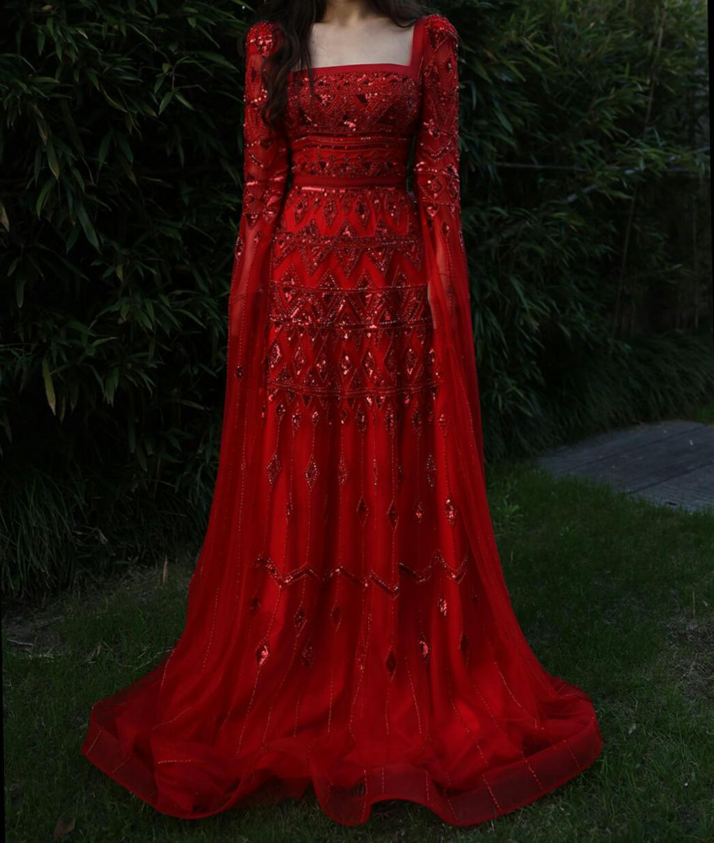 Luxury Wine Red Evening Dress with Cape Sleeves SS461