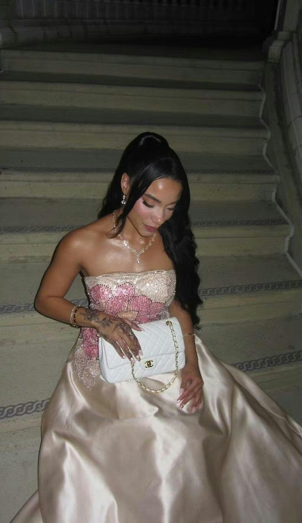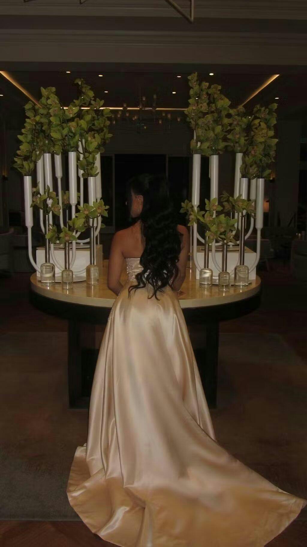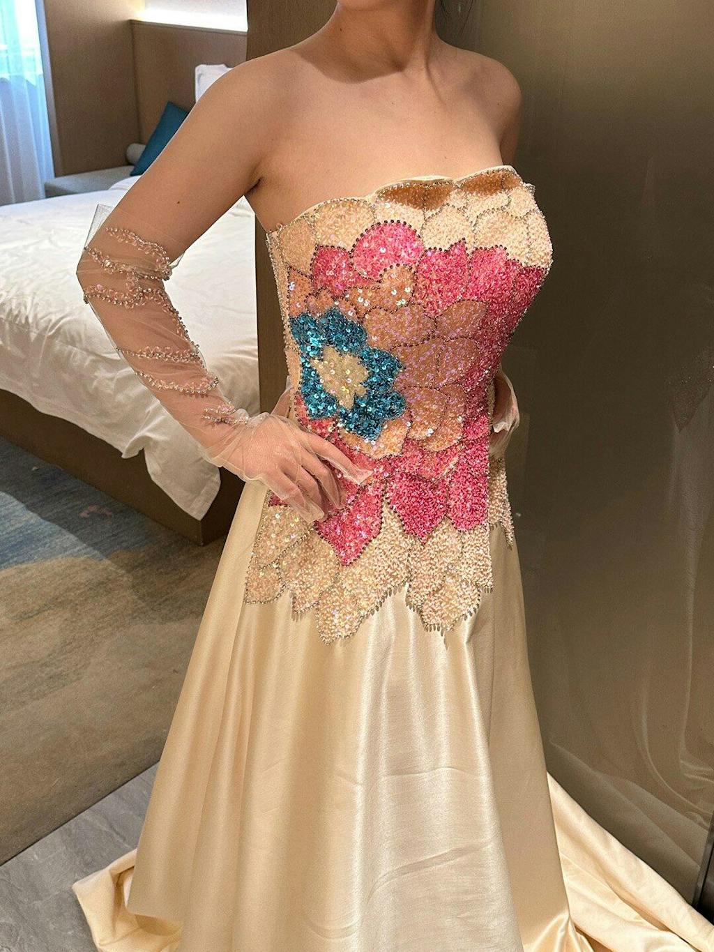 Indulge in true luxury with our SS513 evening dress, featuring intricate beading and a stunning strapless design. Complete your look with included elegant gloves for a truly exclusive and sophisticated ensemble. Elevate your special occasions with this dress that exudes beauty and elegance.