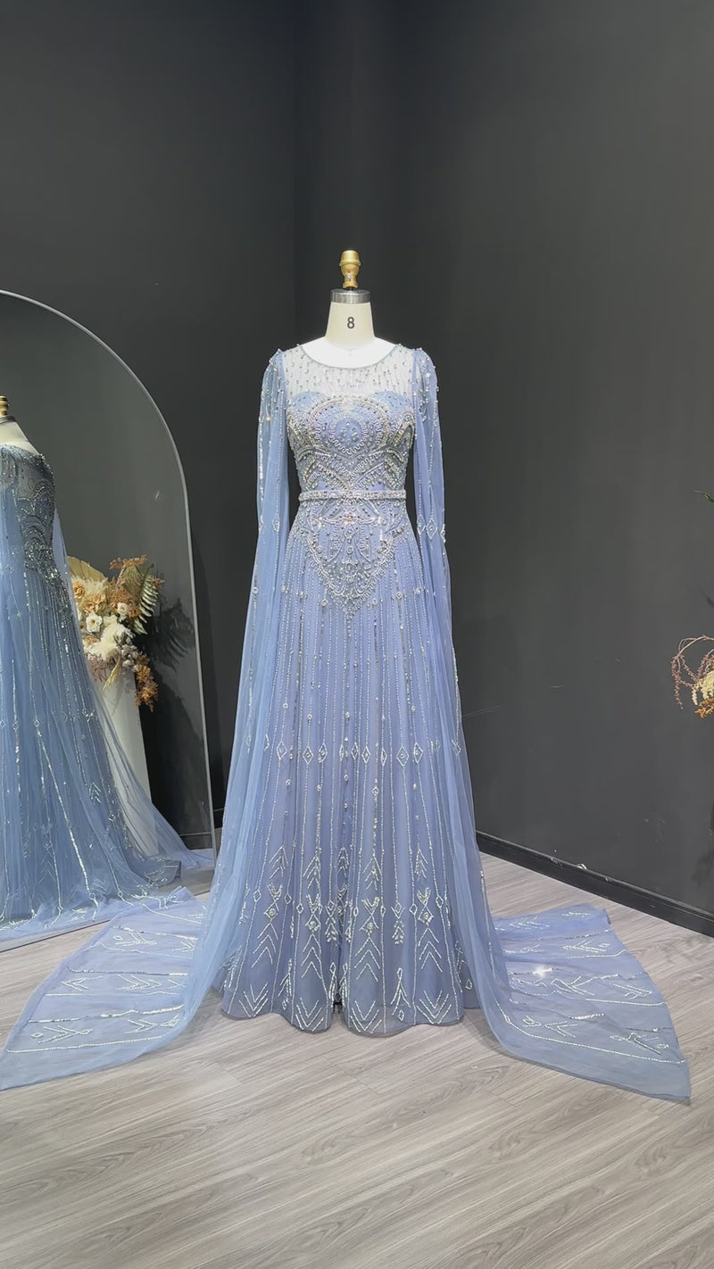 Luxury Blue Beaded Evening Dress with Cape Sleeves SS236