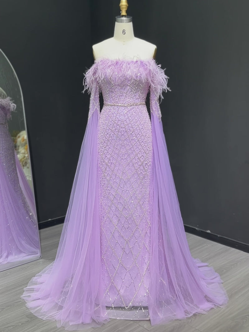 Elevate your evening affair with Sharon Said's Luxury Feather Turquoise Dubai Dress. Designed with Cape Sleeves and featuring a bold lilac hue, it's a timeless Arabic inspired gown for any special occasion. Dazzle in this exquisite design and let your style make a statement.