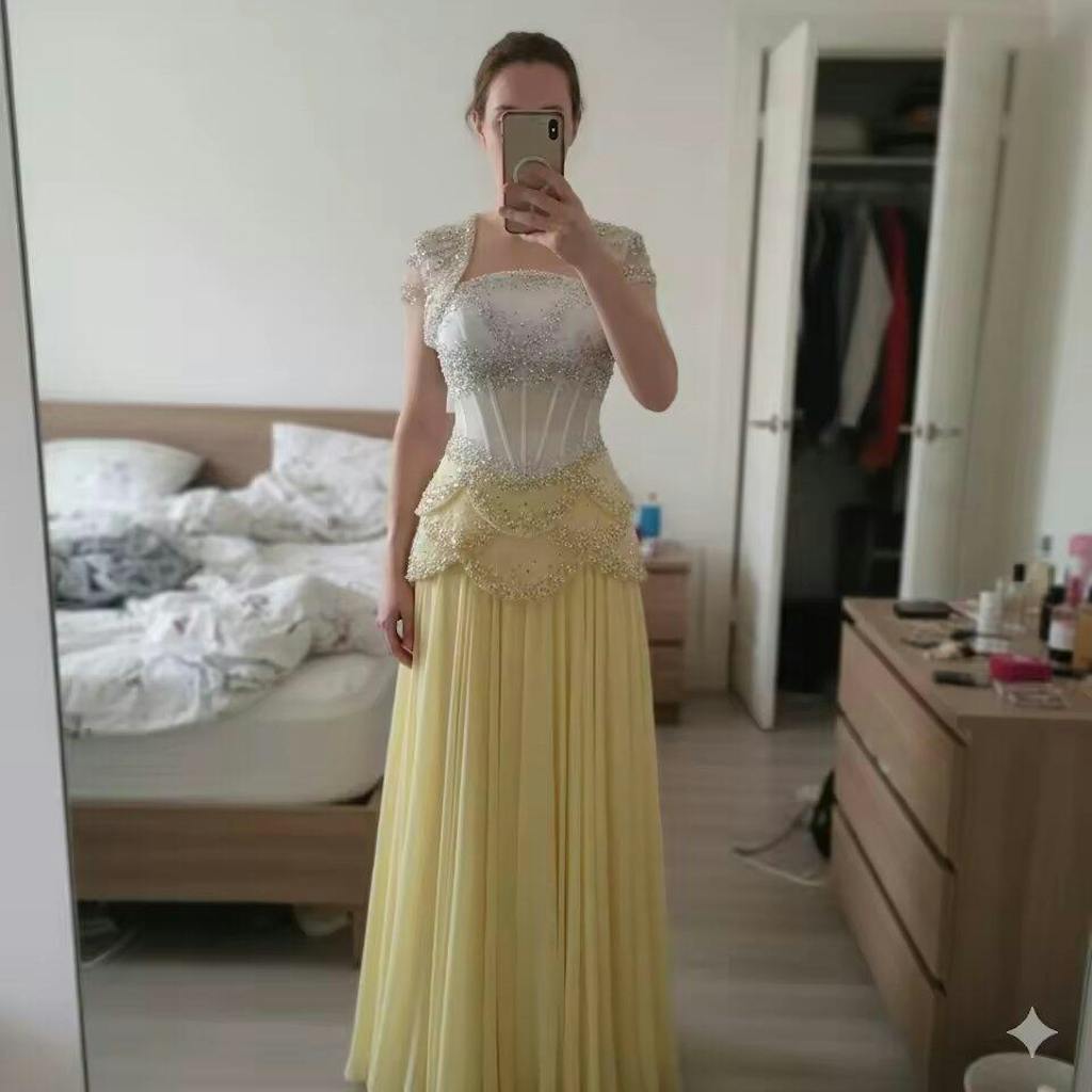 This exquisite evening dress features a harmonious blend of blue and yellow tones, enhanced by luxurious pearl tassel detailing. Paired with a flowing coat, it creates a graceful and sophisticated look perfect for formal events. The elegant design ensures a flattering fit while the delicate embellishments add a touch of refined glamour.