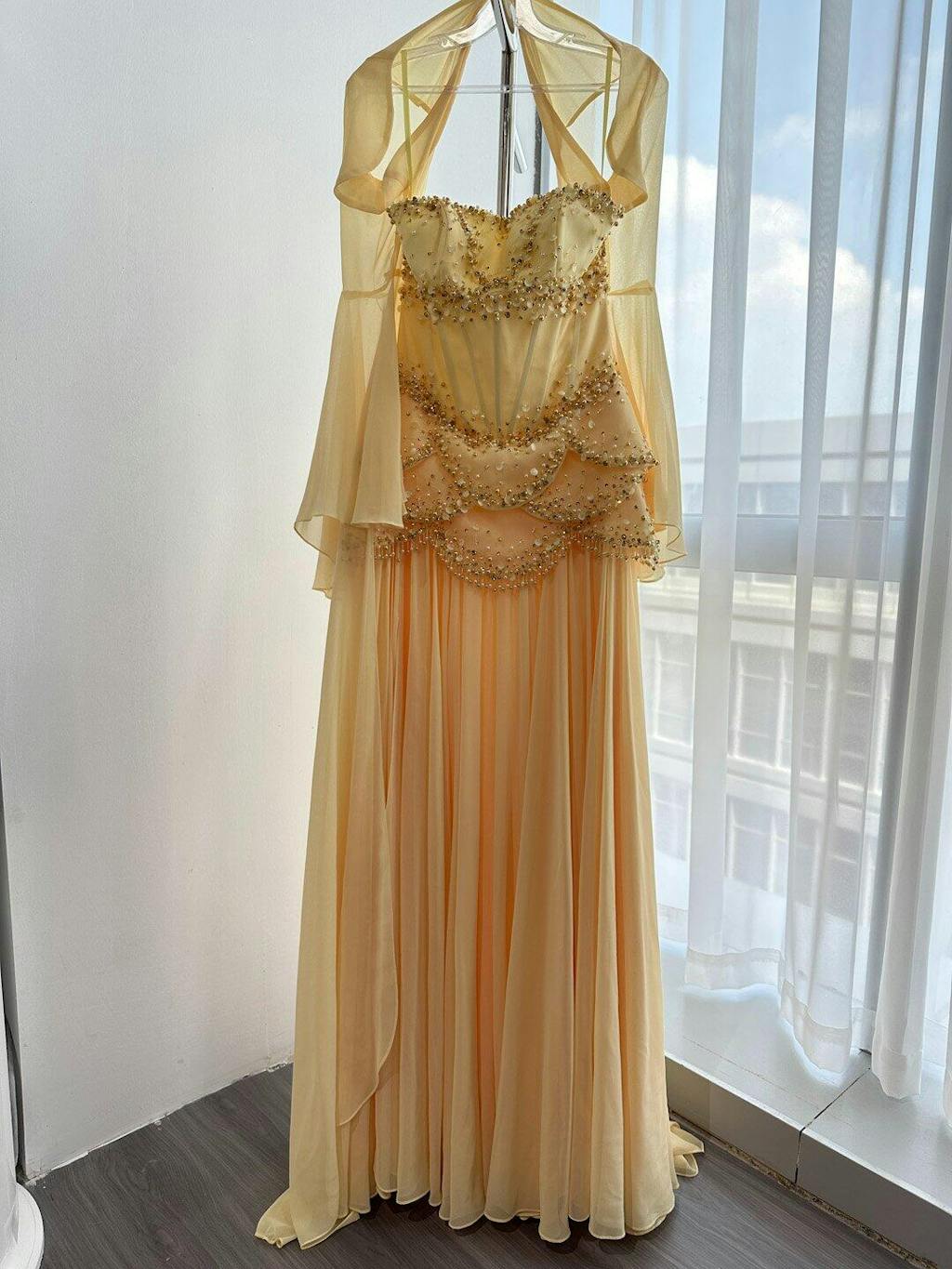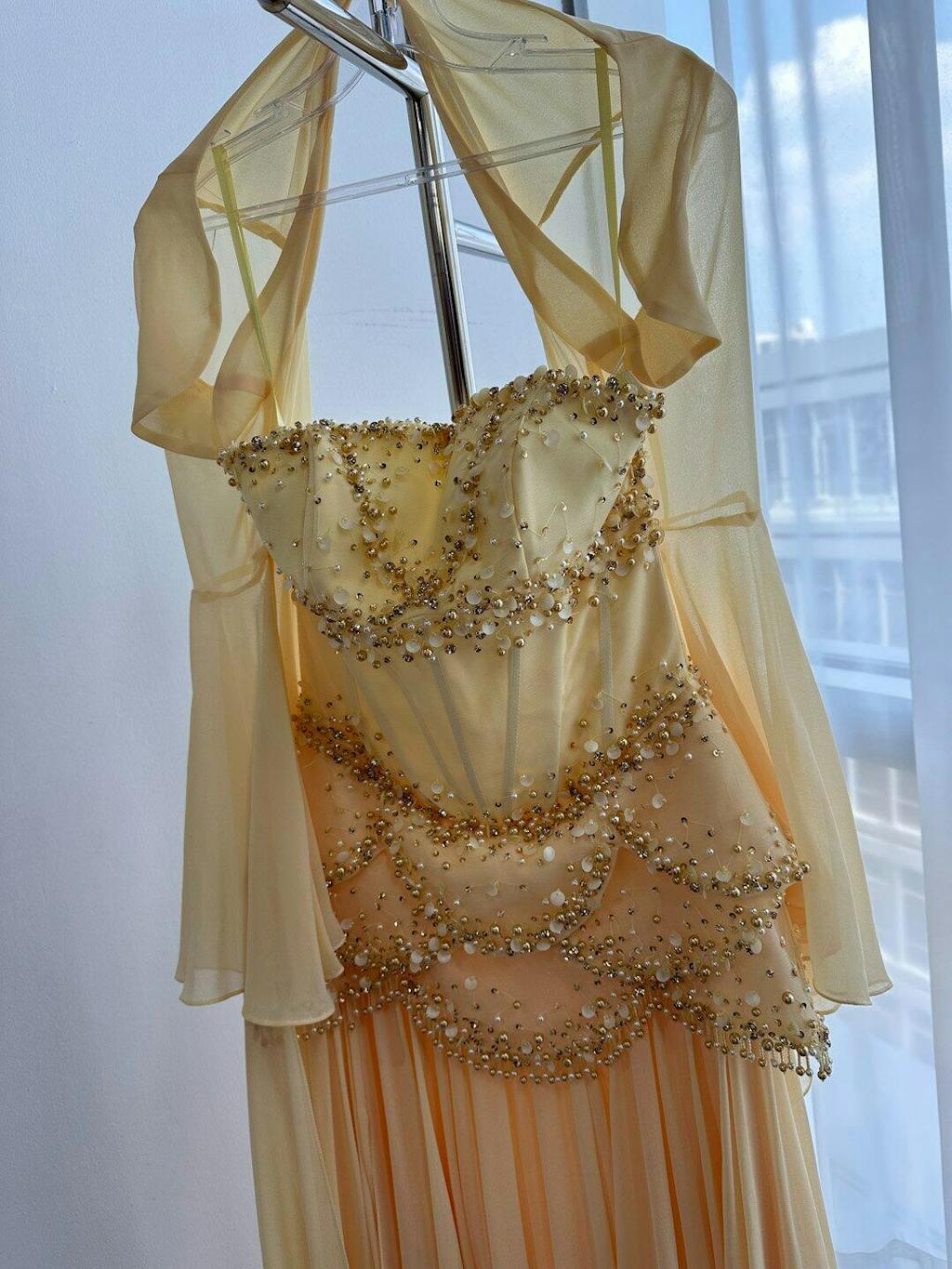 Luxury Pearls Tassel Blue and Yellow Evening Dress with Flowing Sleeves SS286
