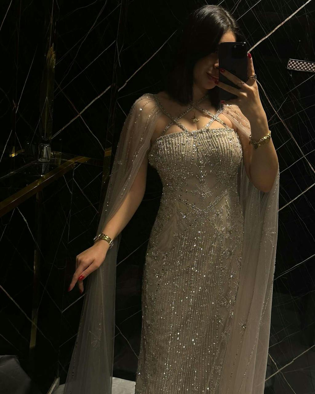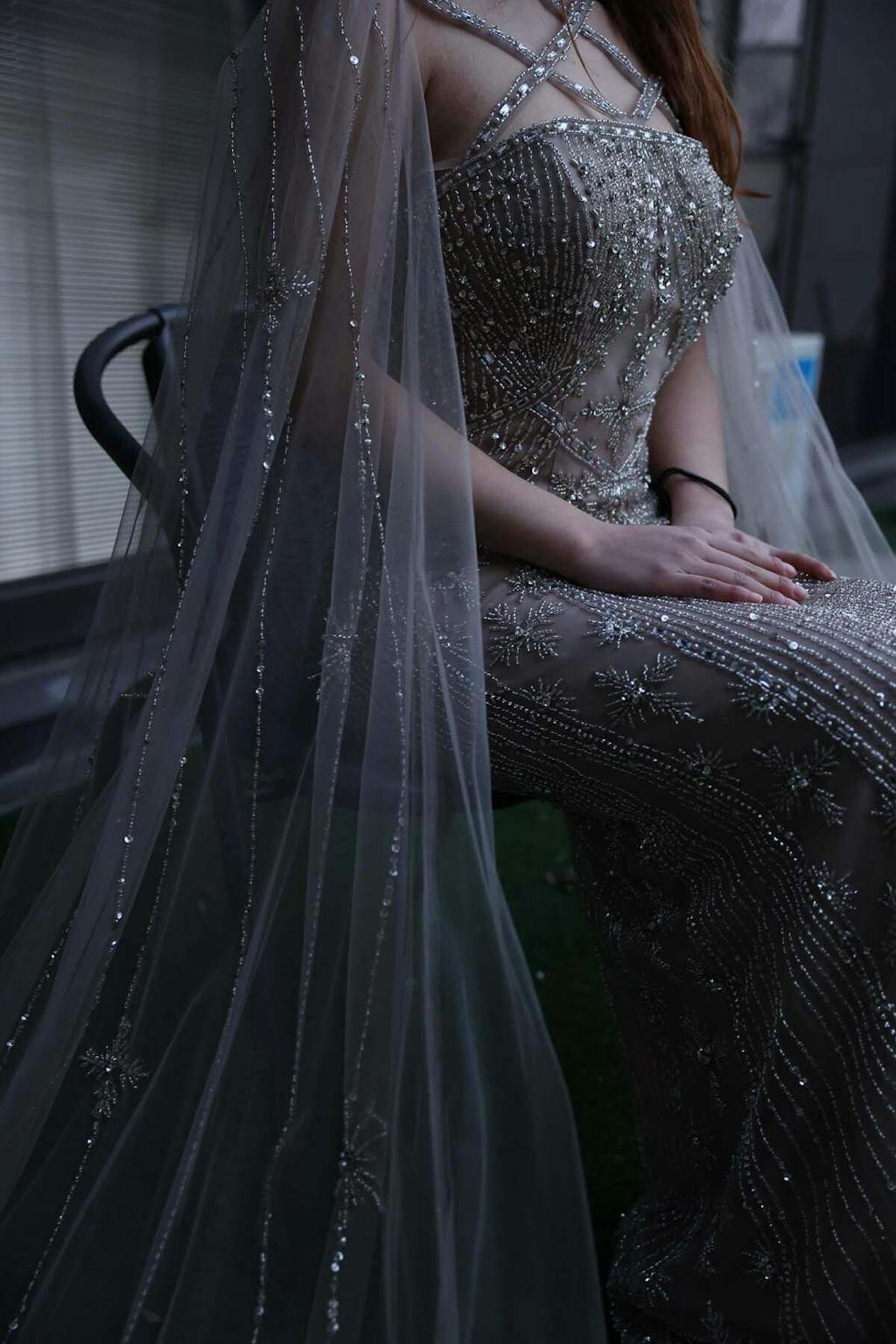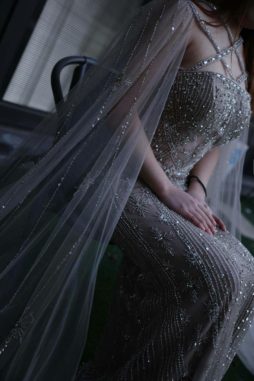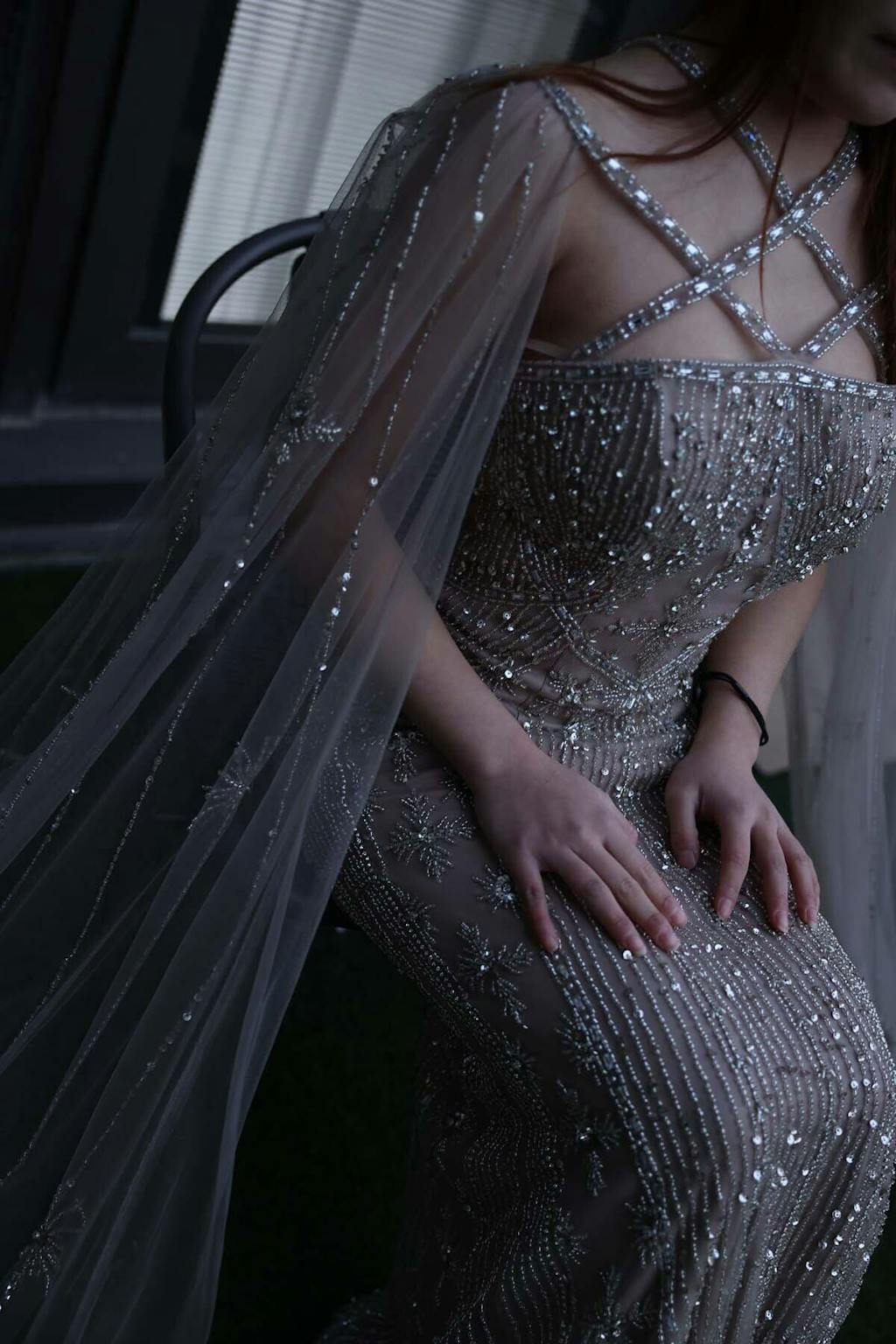 Luxury Aqua Crisscross Evening Dress with Cape Sleeves SS391