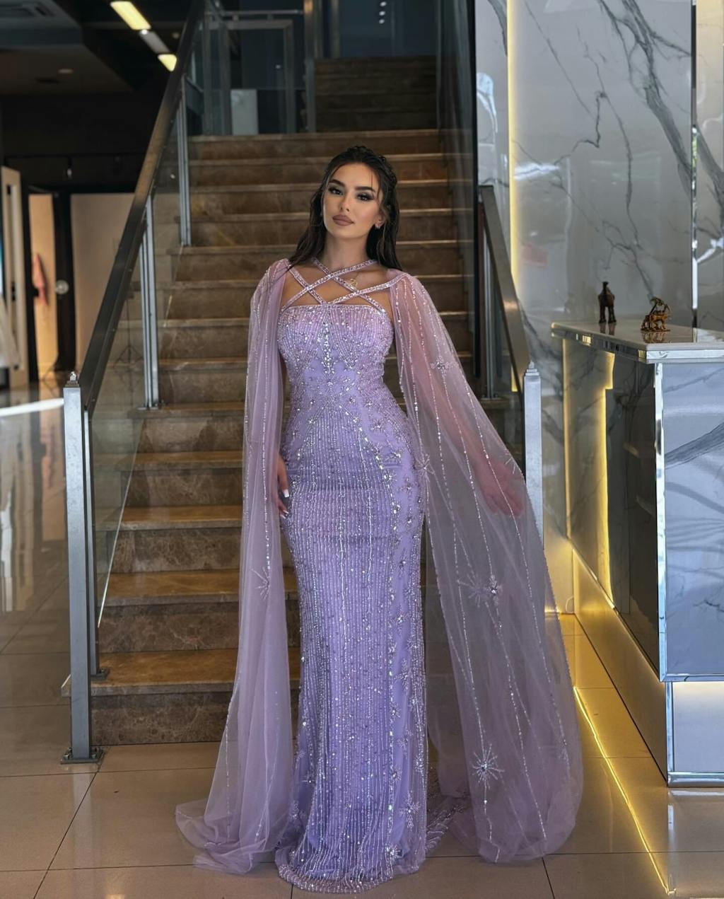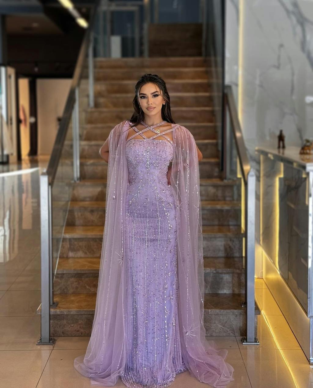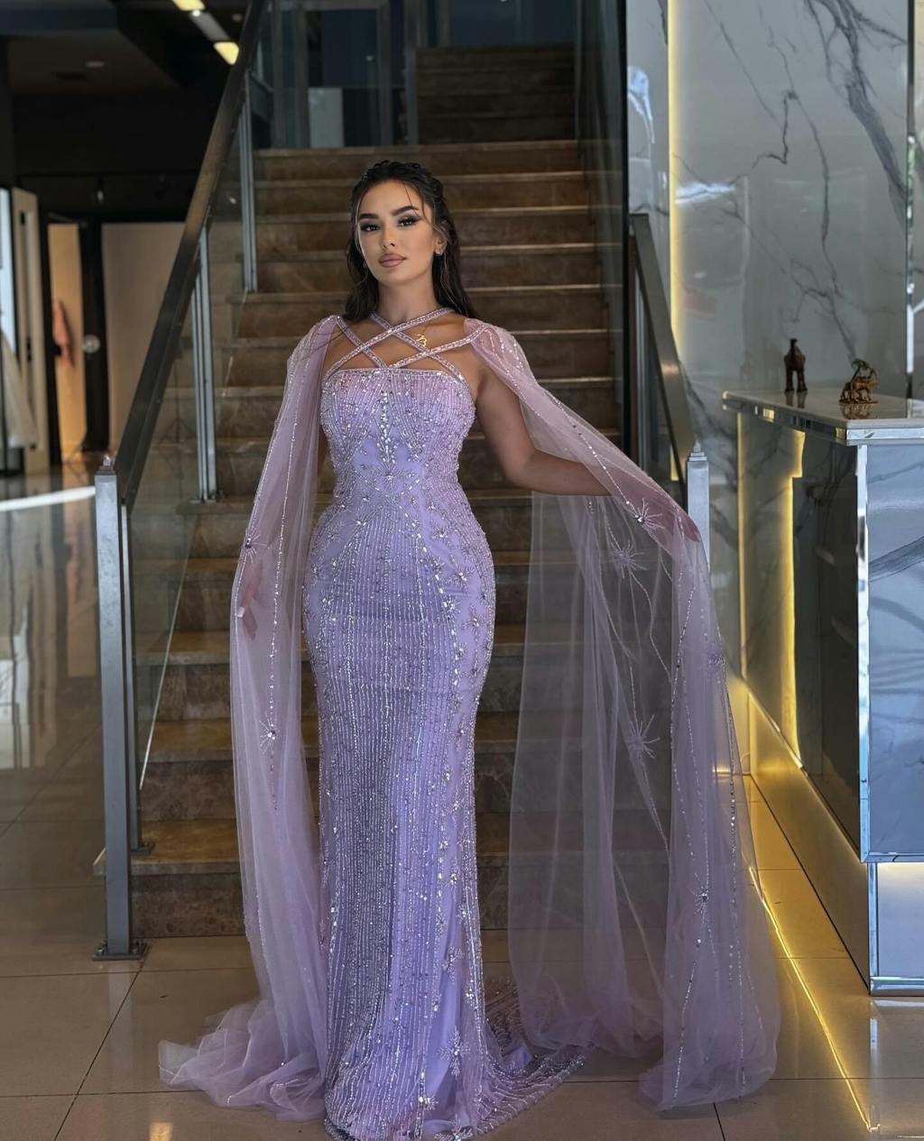 Indulge in luxury and elegance with our Sharon Said evening dress. This mermaid style gown features stunning aqua and lilac hues, a crisscross neckline, and delicate cape sleeves. Perfect for weddings and formal events, this dress will make you feel like a royalty