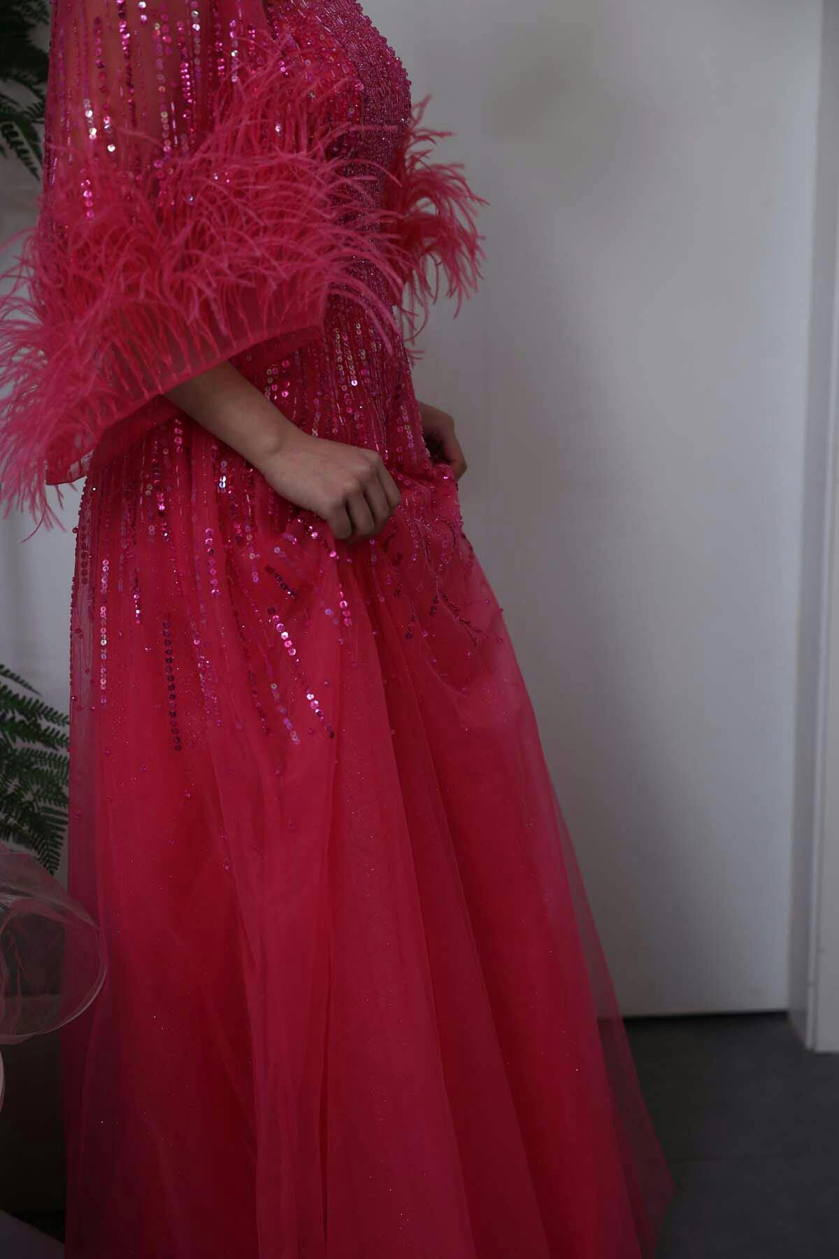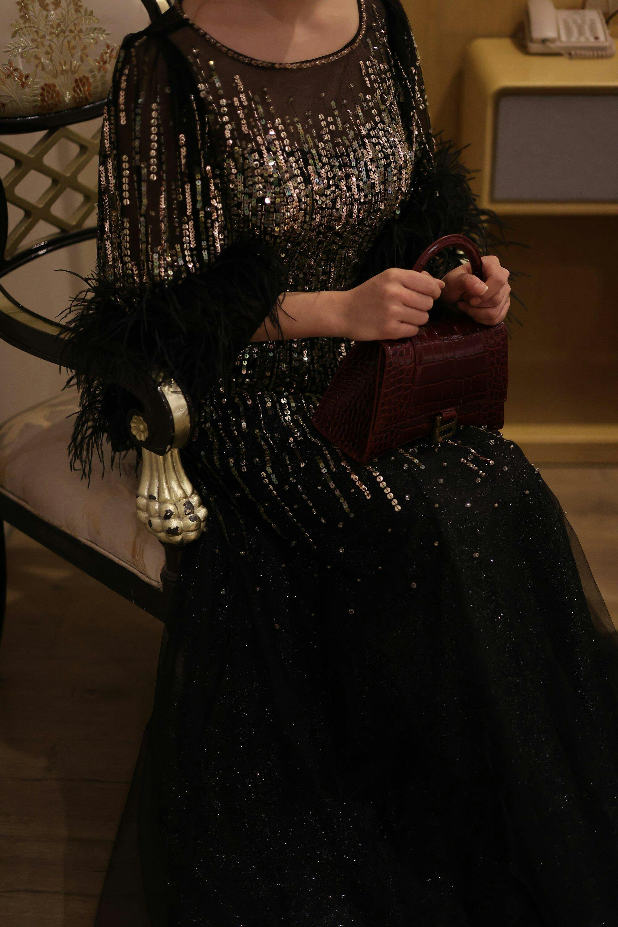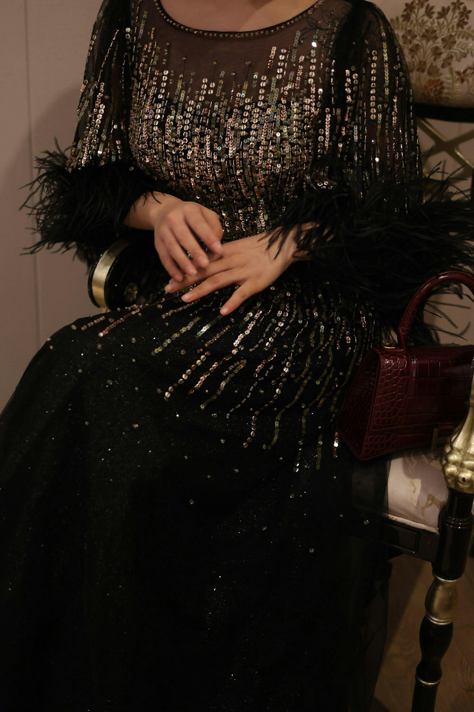 Luxury Feathers Black Half Sleeve Evening Dress SS339
