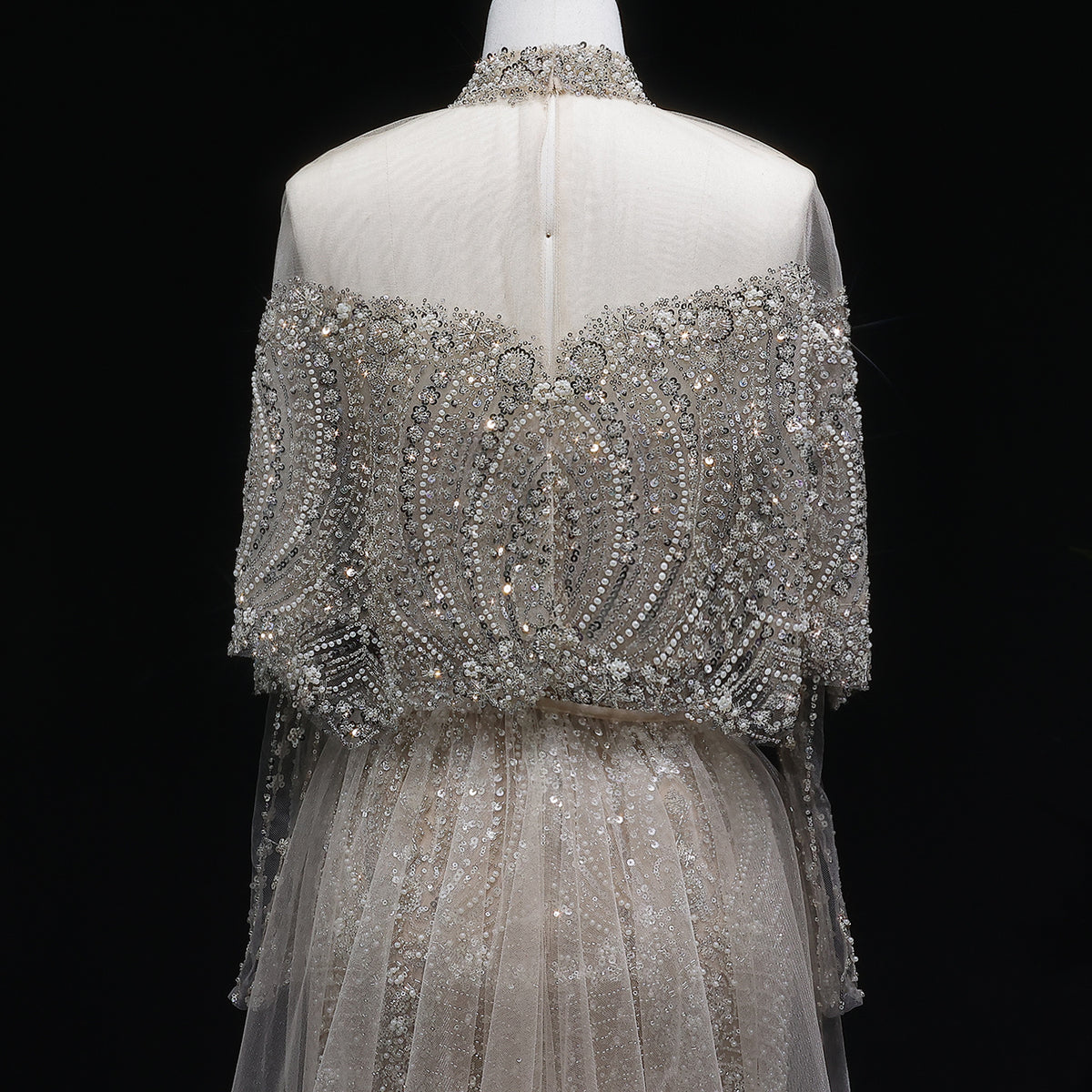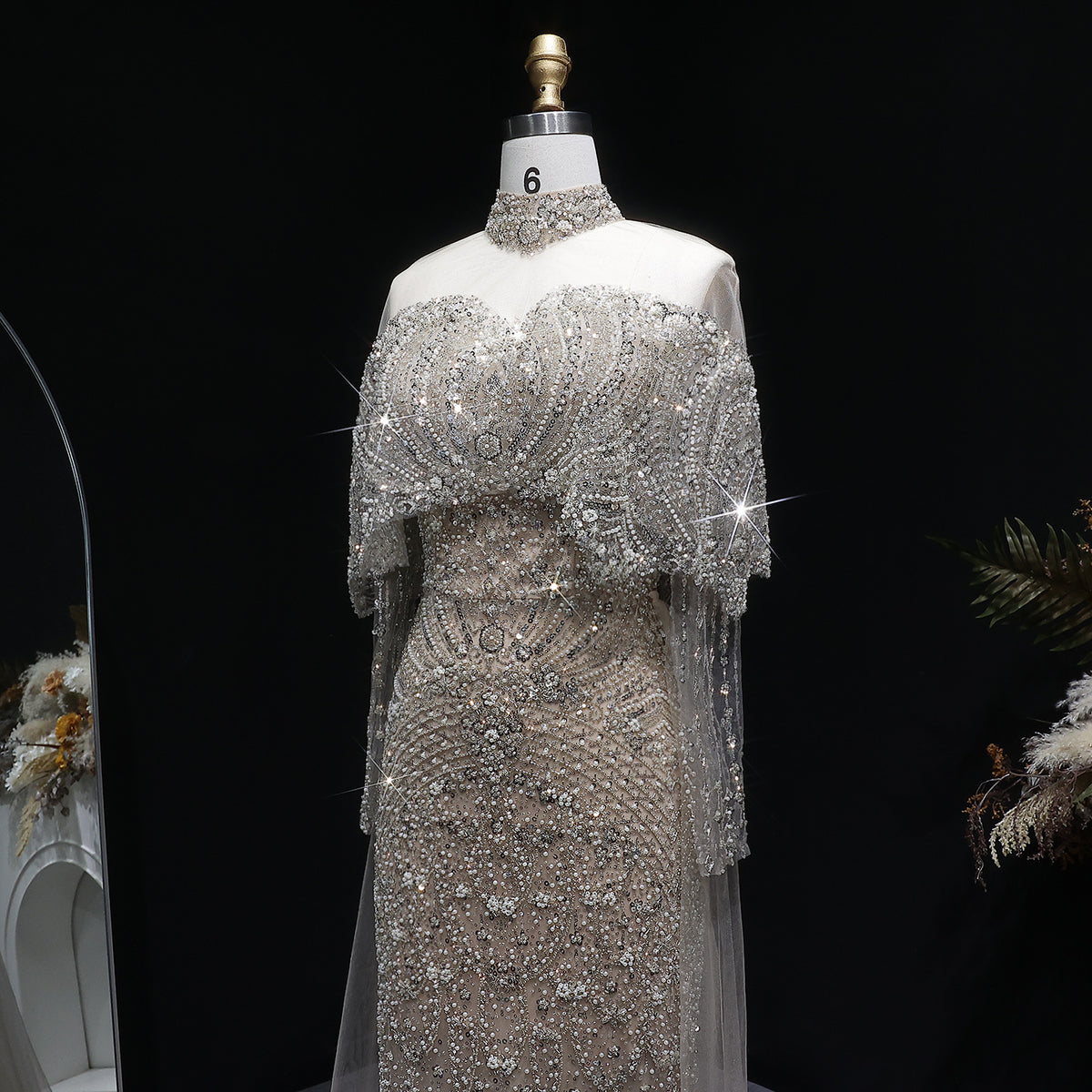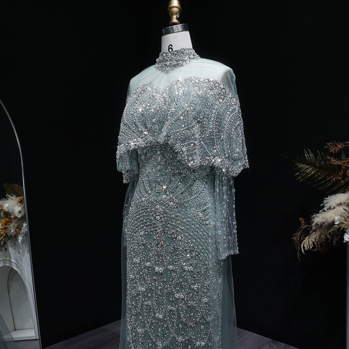 Luxury Gray Beaded Crystal Evening Dress with Cape SS557