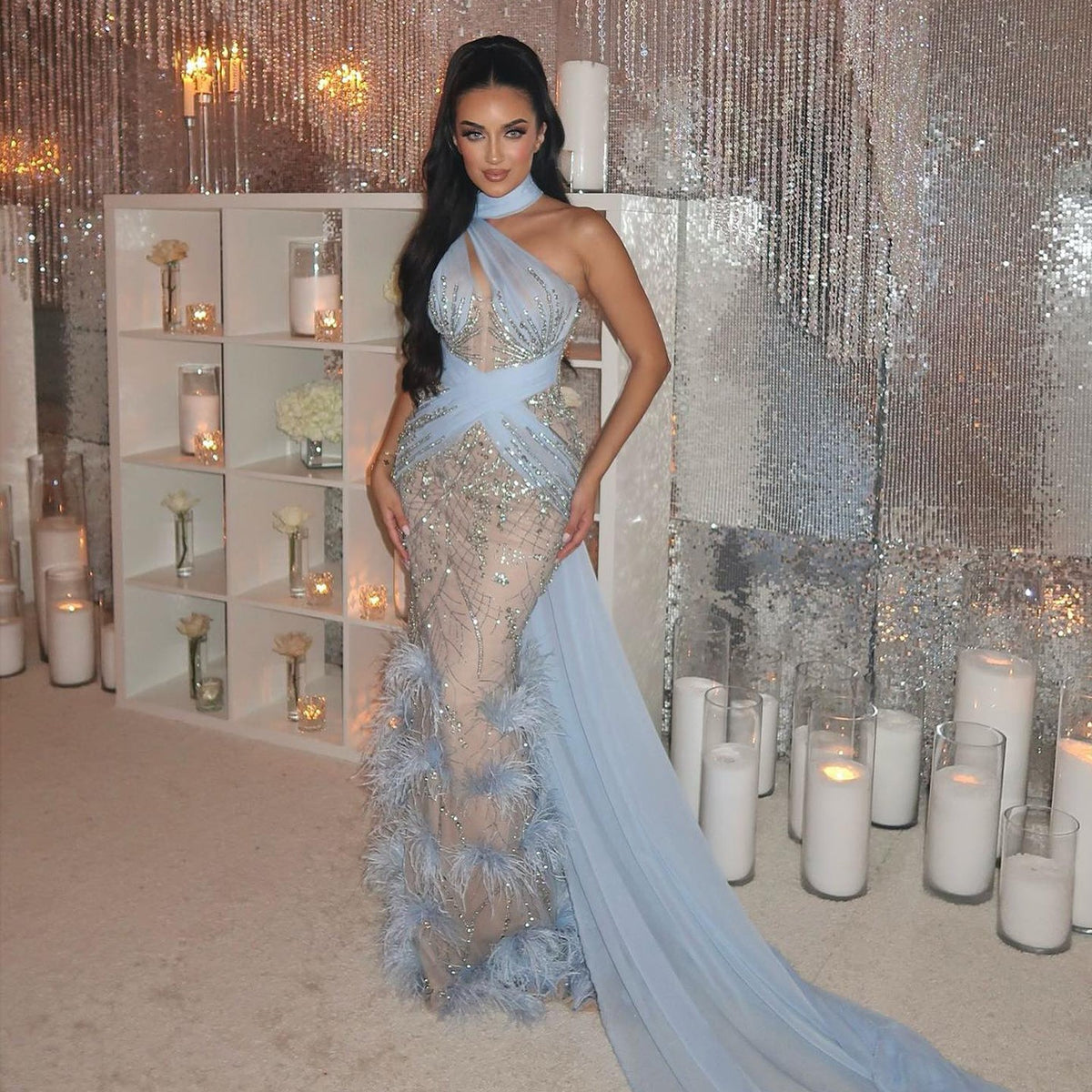 Luxury Blue Off Shoulder Beaded Arabic Evening Dress SS083