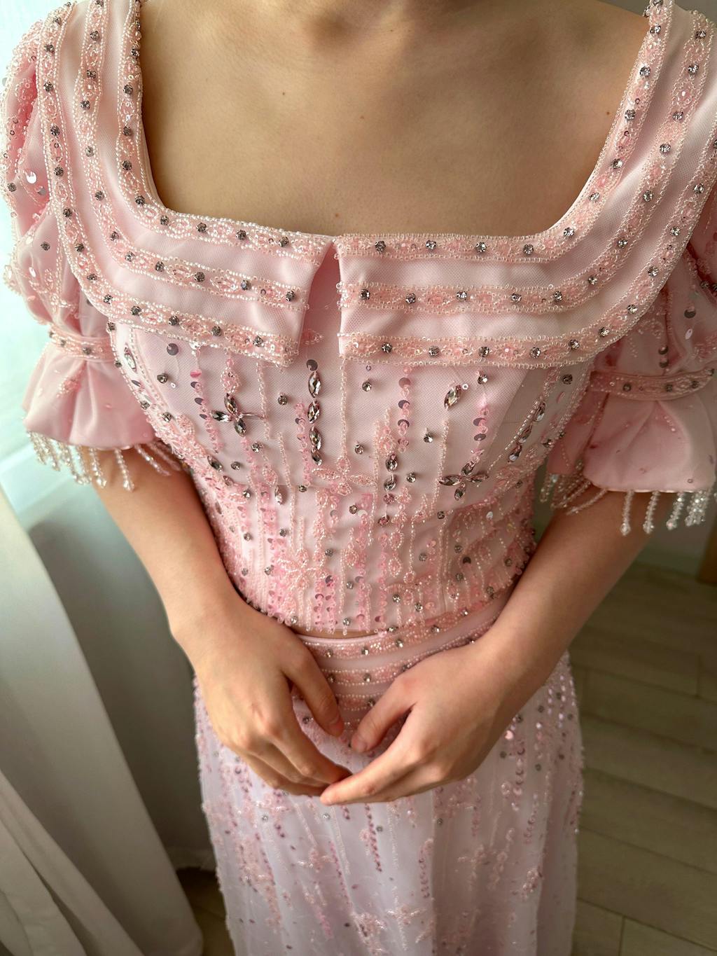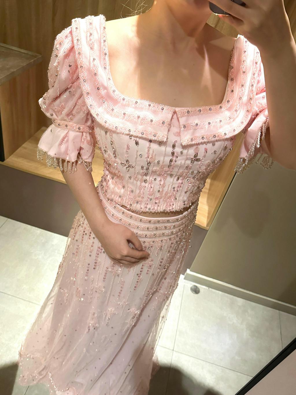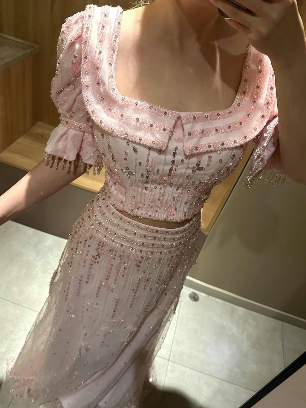 Elegant Sequin Pink Puff Sleeve Two-Piece Evening Dress SS548