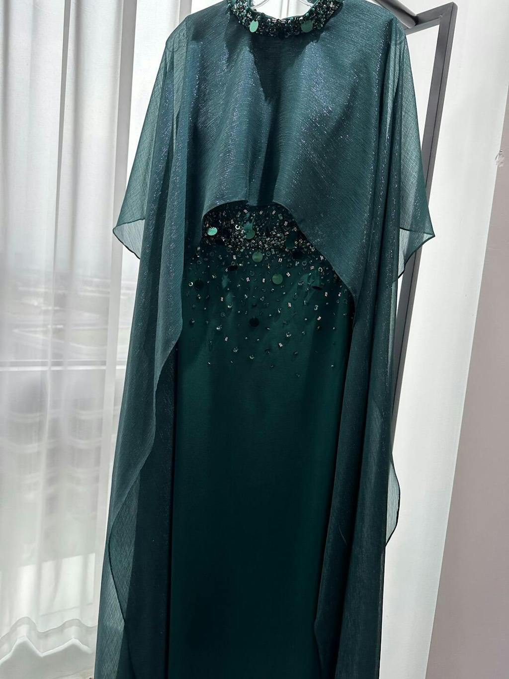 Elevate your evening elegance with this stunning green beaded crystal gown. The intricate beadwork and shimmering crystals create a luminous, eye-catching silhouette perfect for galas, formal events, and special occasions. Dramatic cape sleeves add a touch of theatrical sophistication, while the rich emerald hue flatters all skin tones. This dress design combines timeless glamour with contemporary flair, ensuring you make an unforgettable impression. Crafted for the discerning woman who refuses to compromise on style or presence.