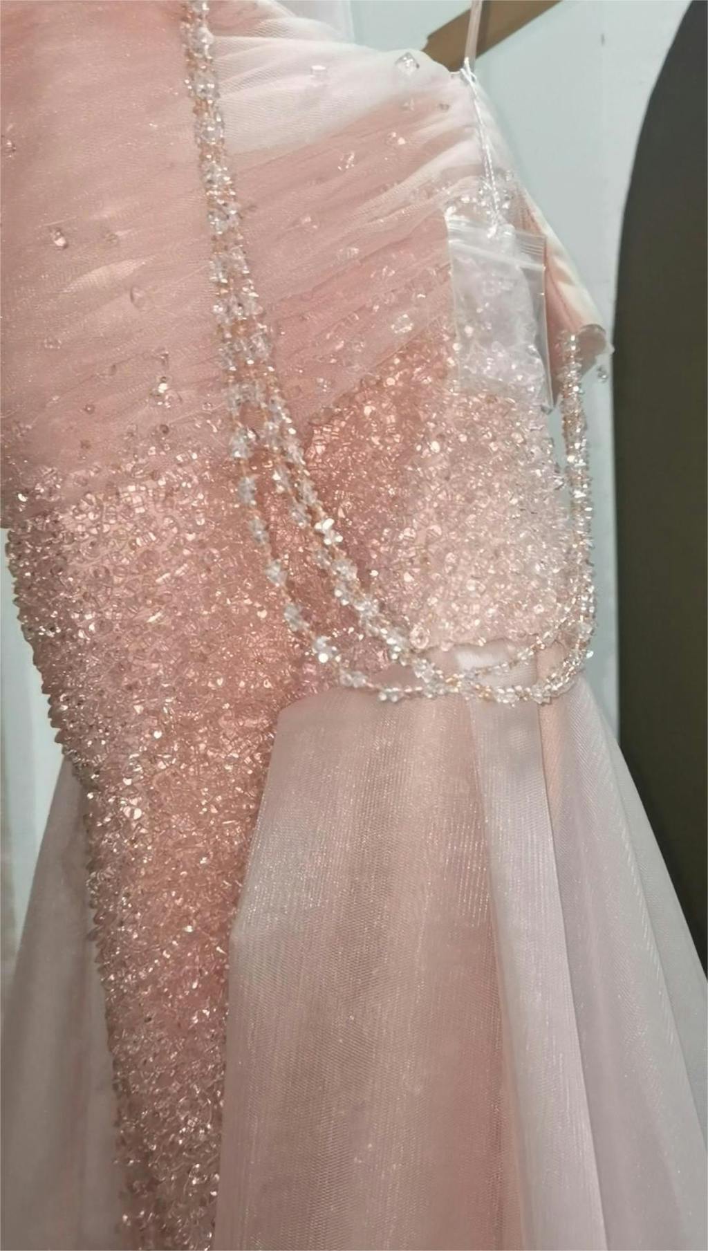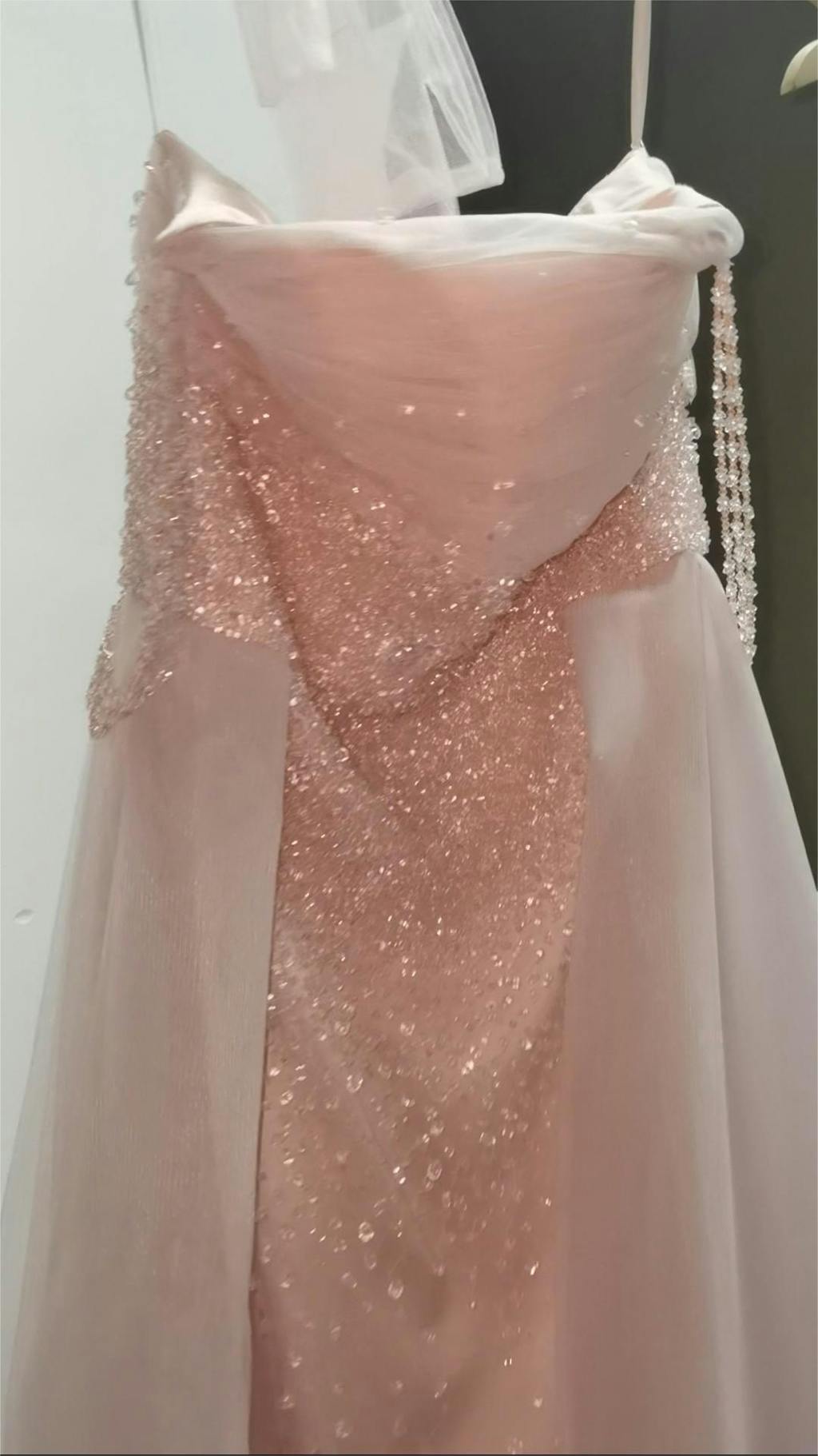 Luxury Beaded Pink Evening Dress with Overskirt Gloves SS429