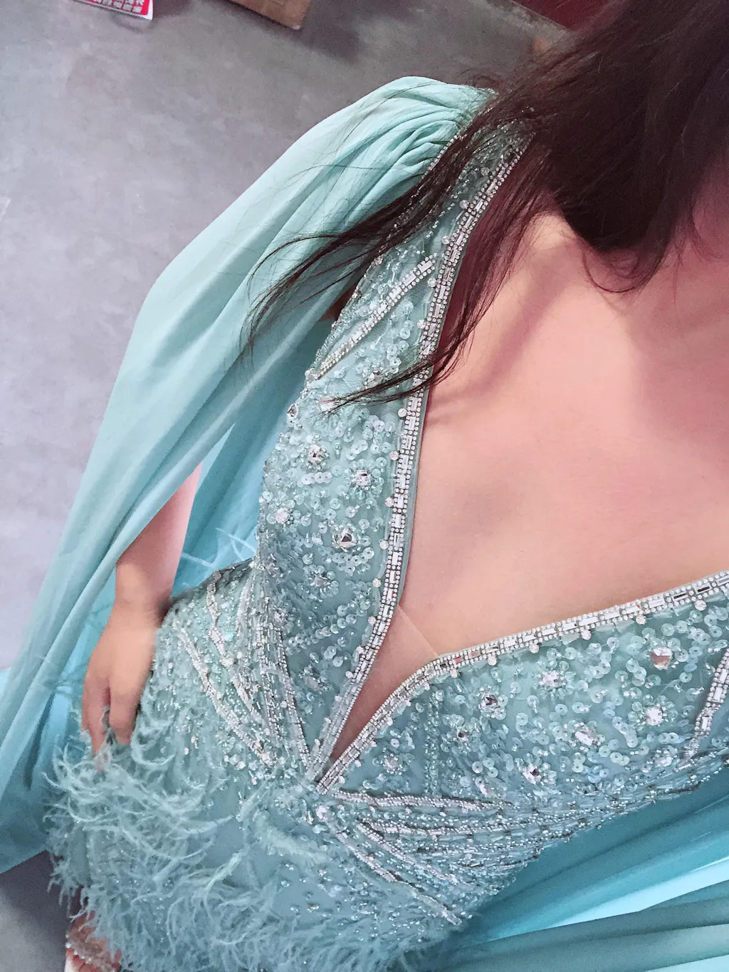 Luxury Feathers Blue Evening Dress with Cape Sleeves SS027