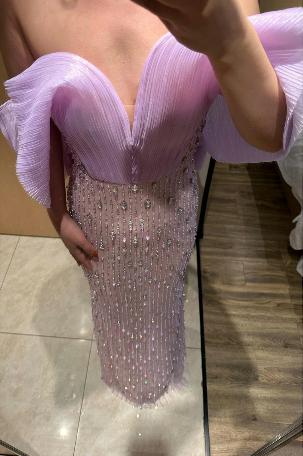 Indulge in luxury with the Sharon Said Dubai Lilac Long Evening Dress. The elegant off shoulder design and beautiful Arabic style make this gown a perfect choice for weddings, parties, or proms. Look and feel stunning with this exquisite piece, guaranteed to turn heads.
