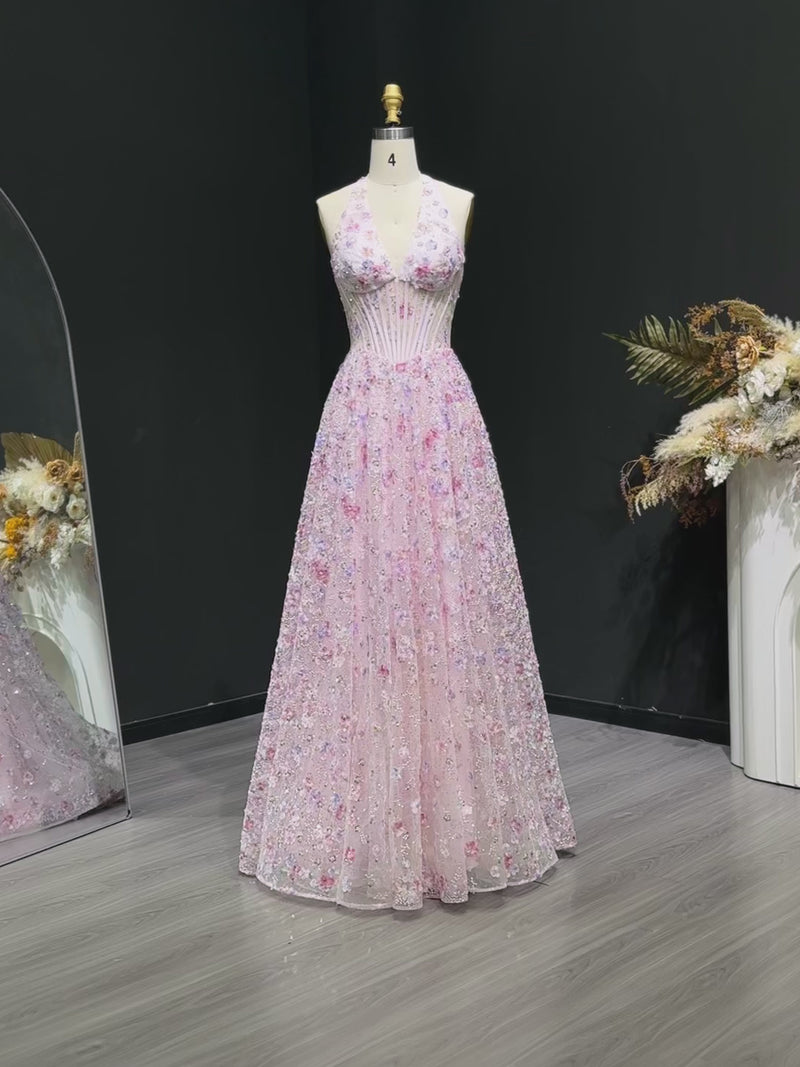 Luxury Pink Halter Neck Sequin Floral Embroidered Prom Dress SH051
