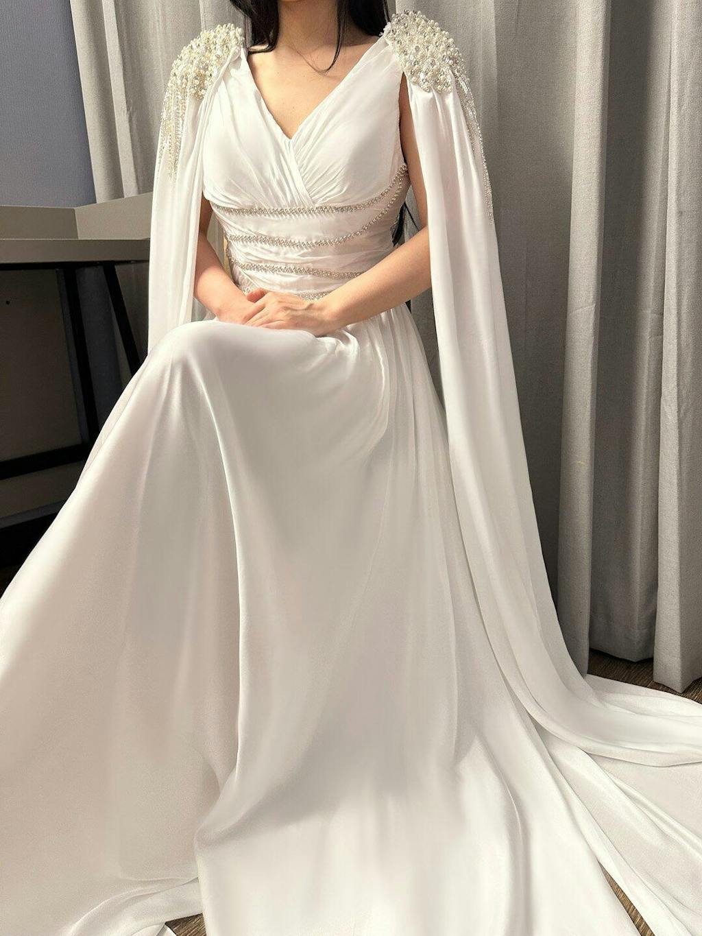 Indulge in luxury and make a statement at your next evening event with our exquisite Crystal Rose Gold Evening Dress! The intricate detailing of sparkling crystals and the elegant cape add a touch of glamour, making you the center of attention. Showcase your style and confidence with this must-have dress.