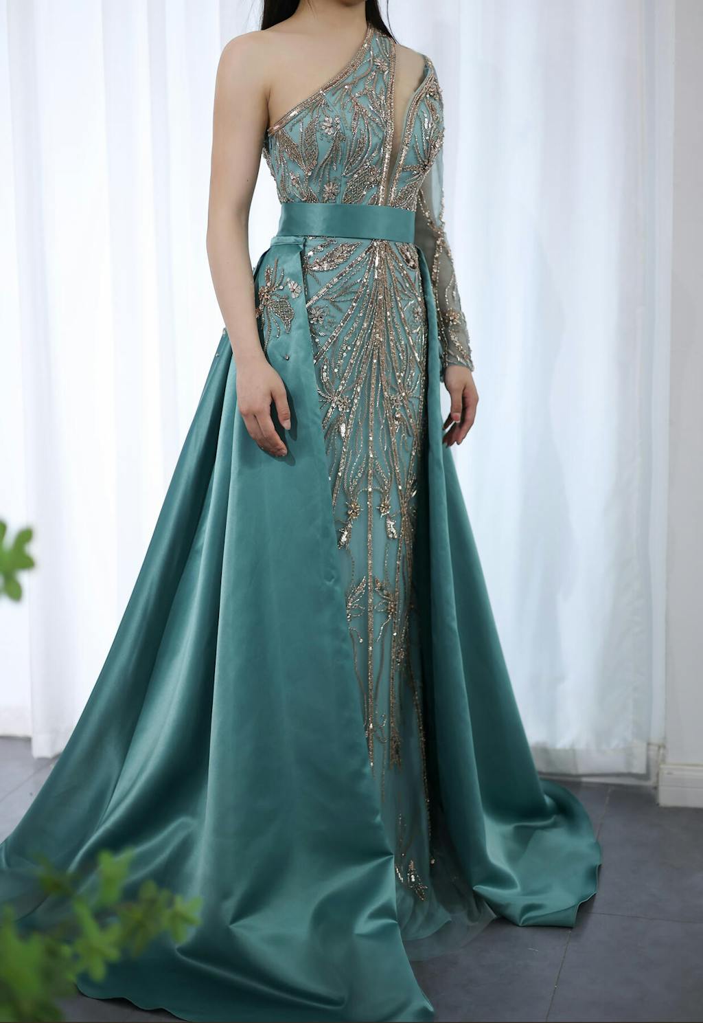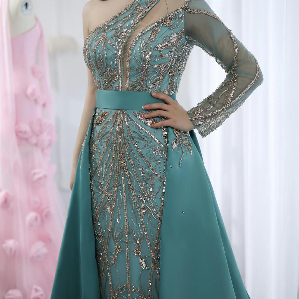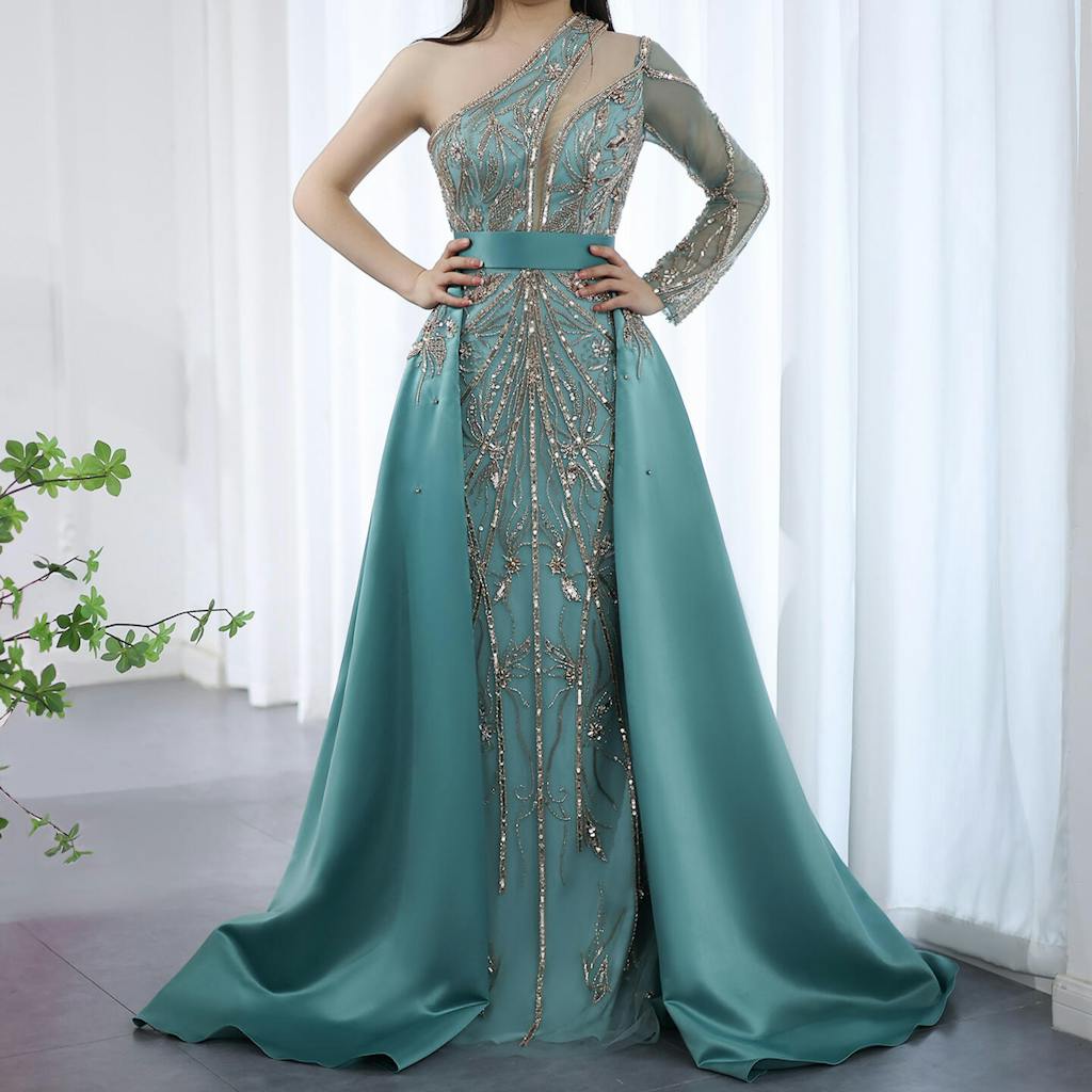 Luxury Turquoise One-Shoulder Evening Dress with Overskirt SS307
