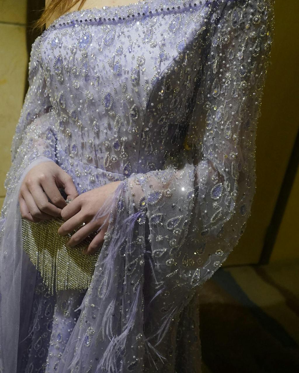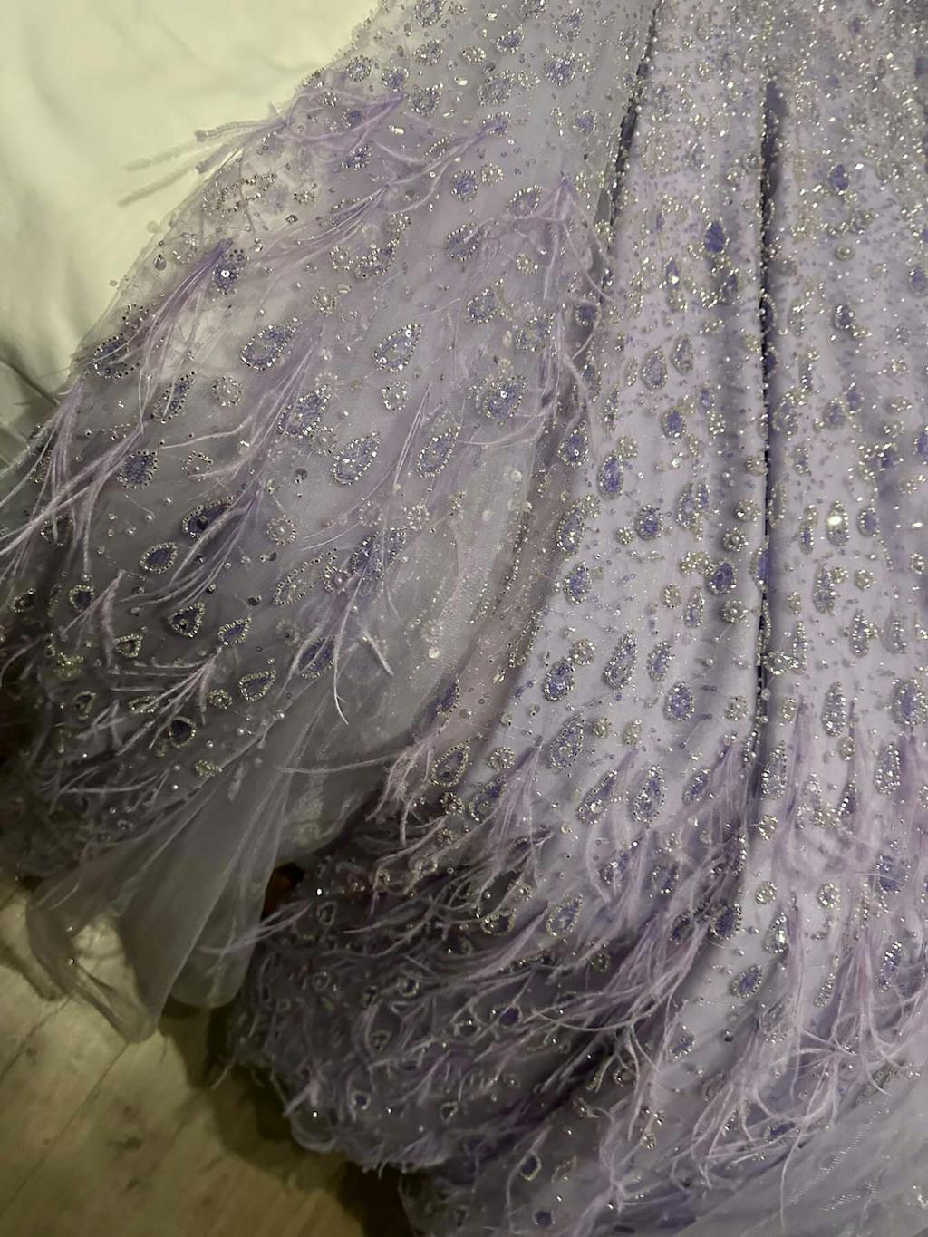 Experience true luxury and elegance with the Sharon Said Evening Dress. Featuring a unique one shoulder design and delicate cape sleeves, this dress exudes sophistication. Adorned with feathers in a beautiful rose gold and lilac color, it is the perfect choice for any wedding or party. SS438.