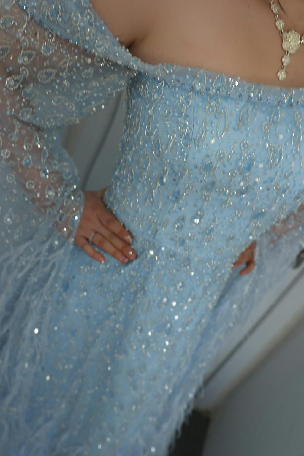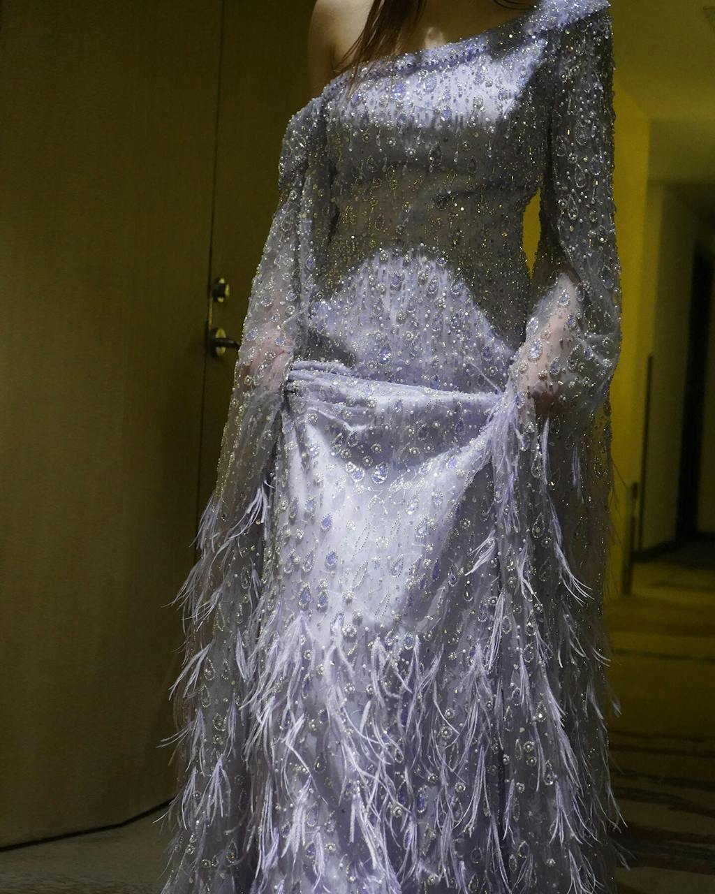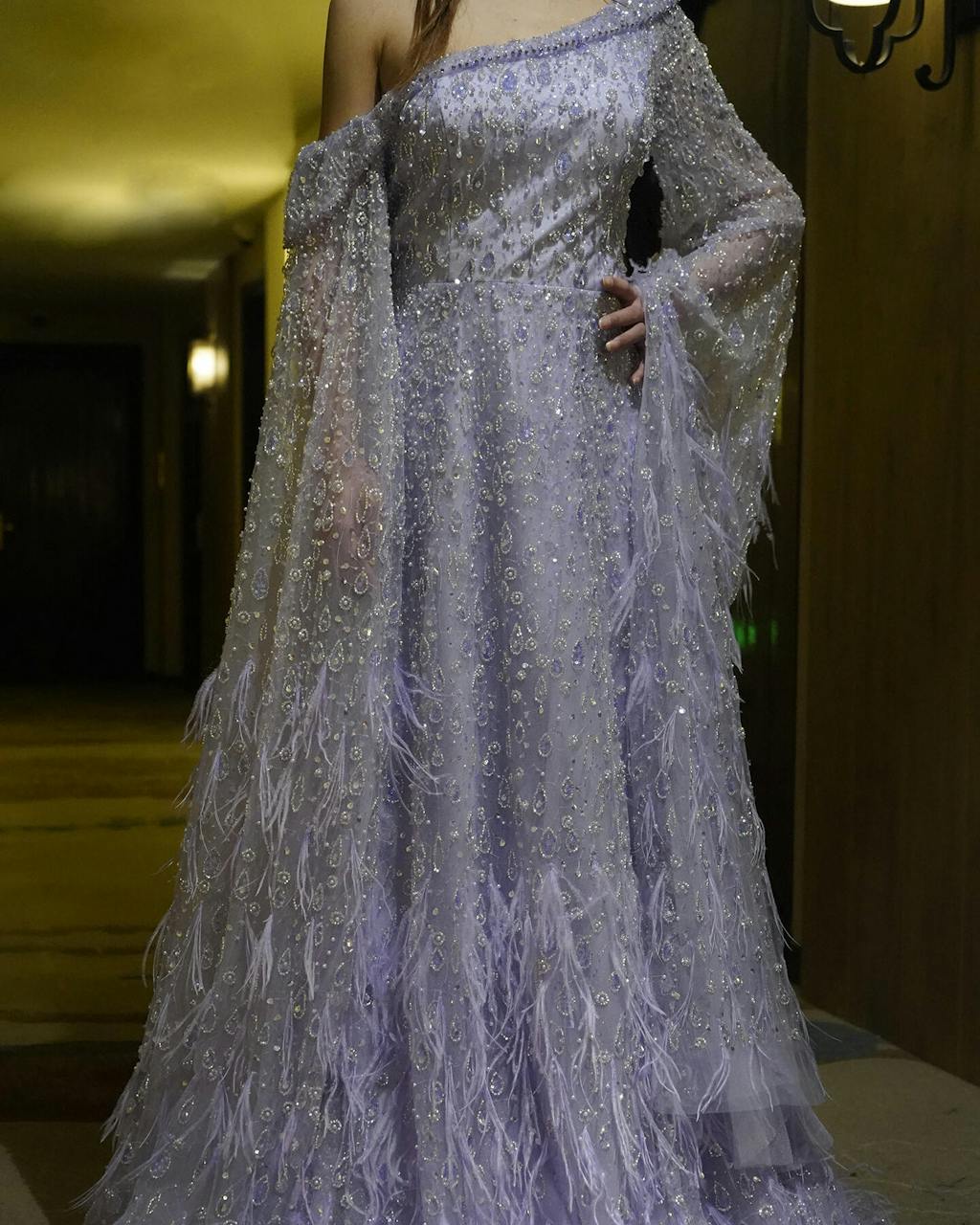Luxury Feather One Shoulder Evening Dress with Cape Sleeves SS438