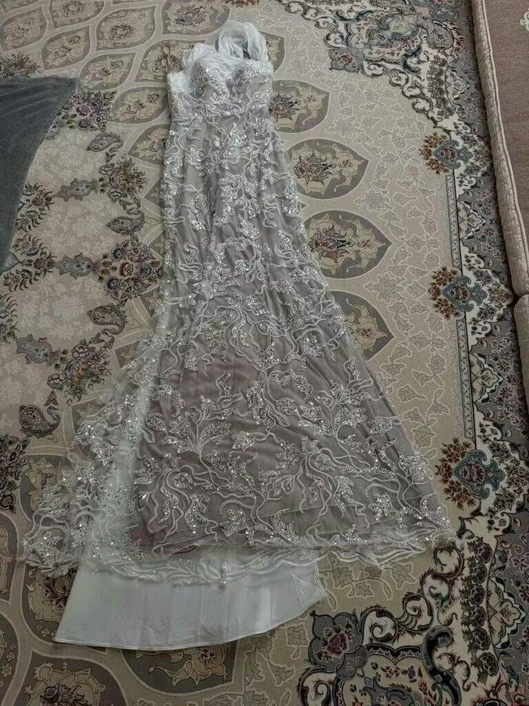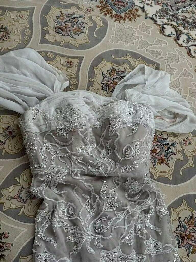 This elegant ivory evening dress features delicate sequin embellishments and intricate embroidery, creating a refined and timeless look. The off-shoulder design adds a graceful touch, highlighting the neckline while providing sophisticated charm. Perfect for formal events, this dress combines subtle sparkle with classic style to ensure you stand out with poise and elegance.