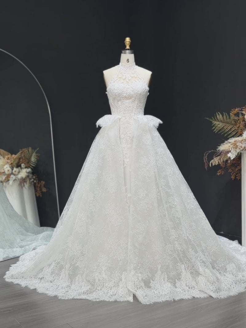 Luxury White A-Line Wedding Dress with Lace Embroidery and Overskirt SW651