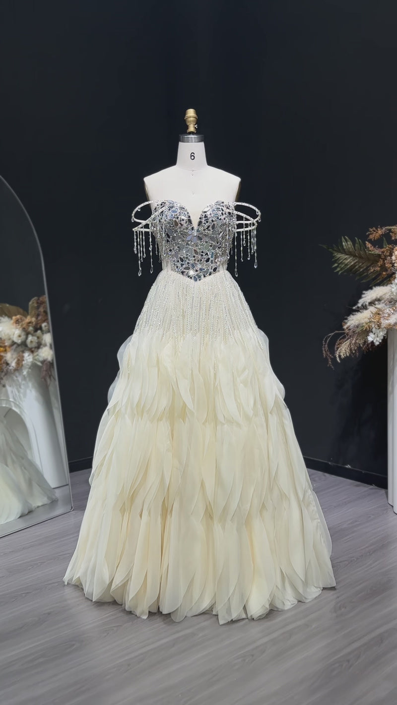 Luxury Beige Tassel Strapless Layered Tulle Ball Gown Evening Dress SS734
