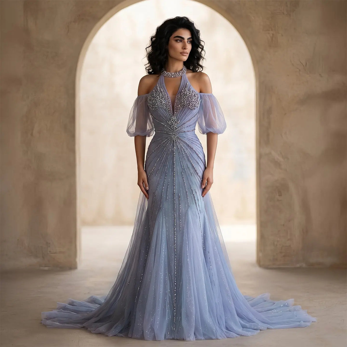 Luxury Turquoise Beaded Deep V Fitted Mermaid Evening Dress with Cap SS727