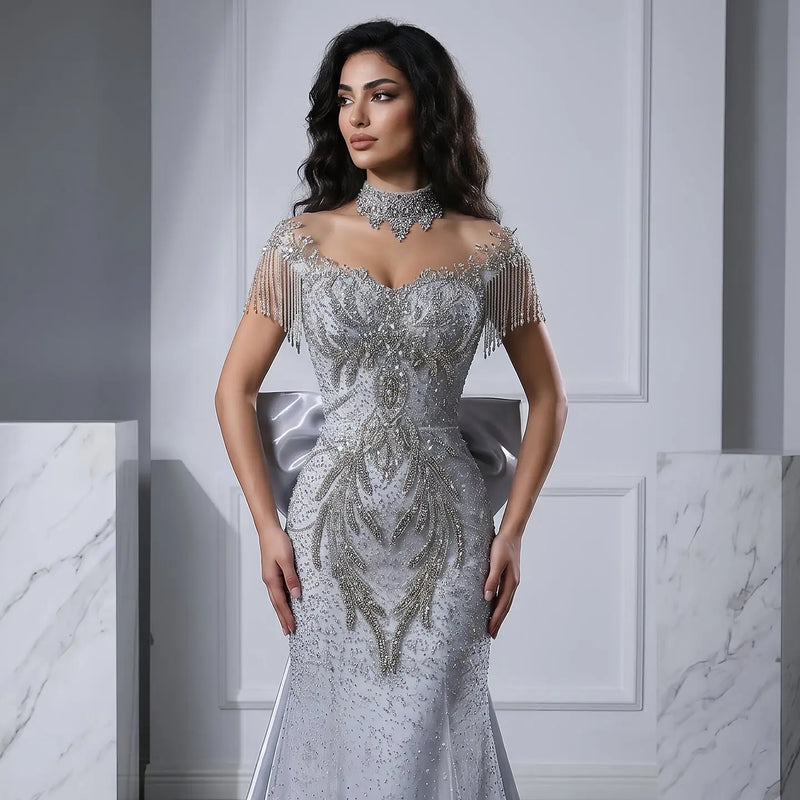 Luxury Silver Gray Beaded Train Evening Dress with Bow Tie and Necklace SS722