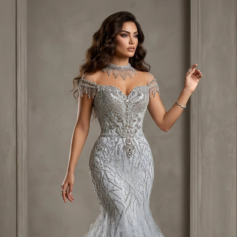 Luxury Silver Gray Beaded Tulle Mermaid Train Evening Dress SS746
