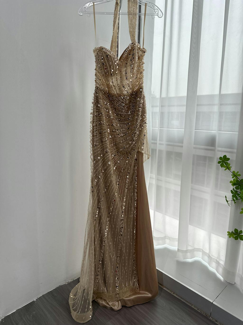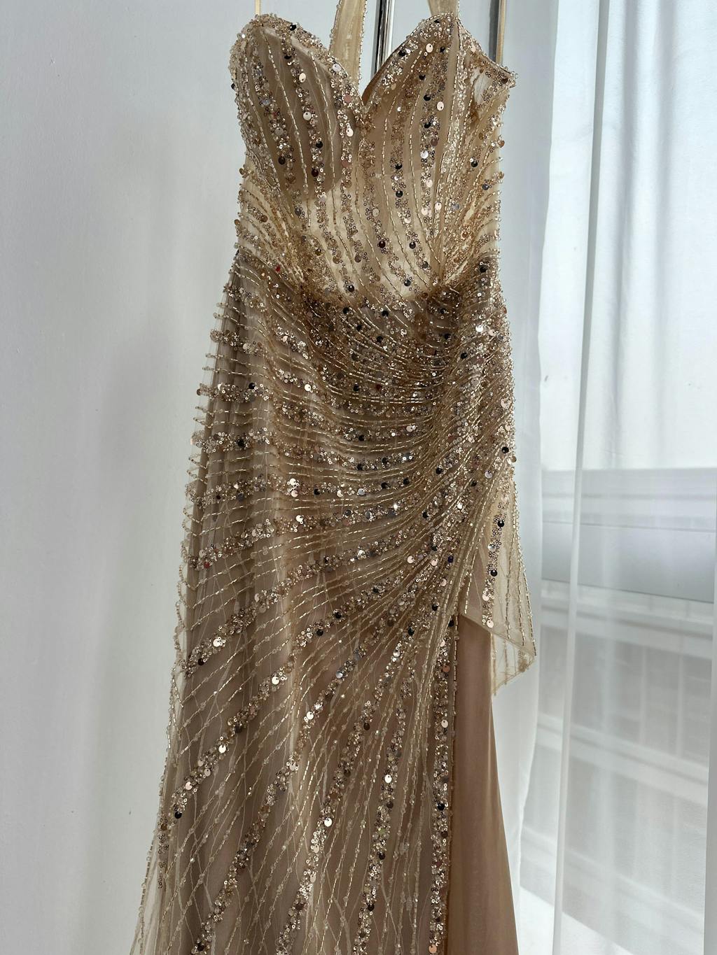 Luxuriöses Abendkleid mit Kristallen und Schlitz in Champagner SS084