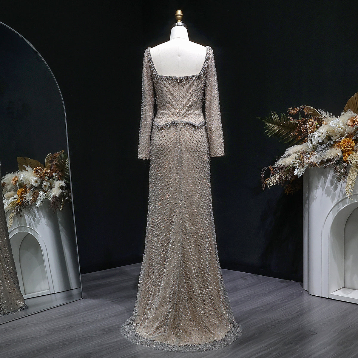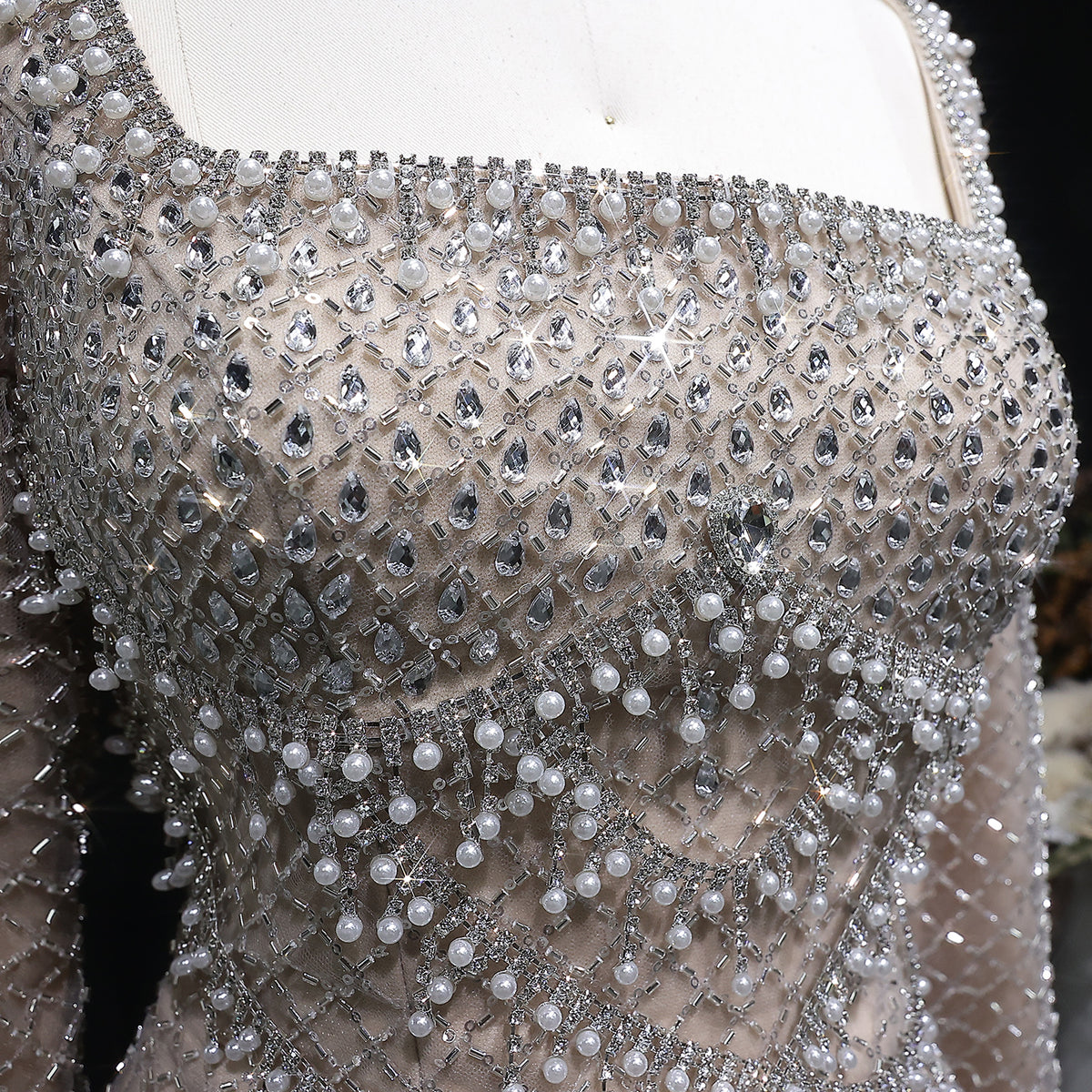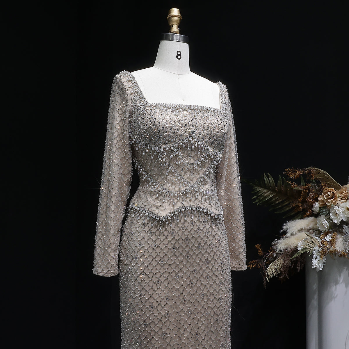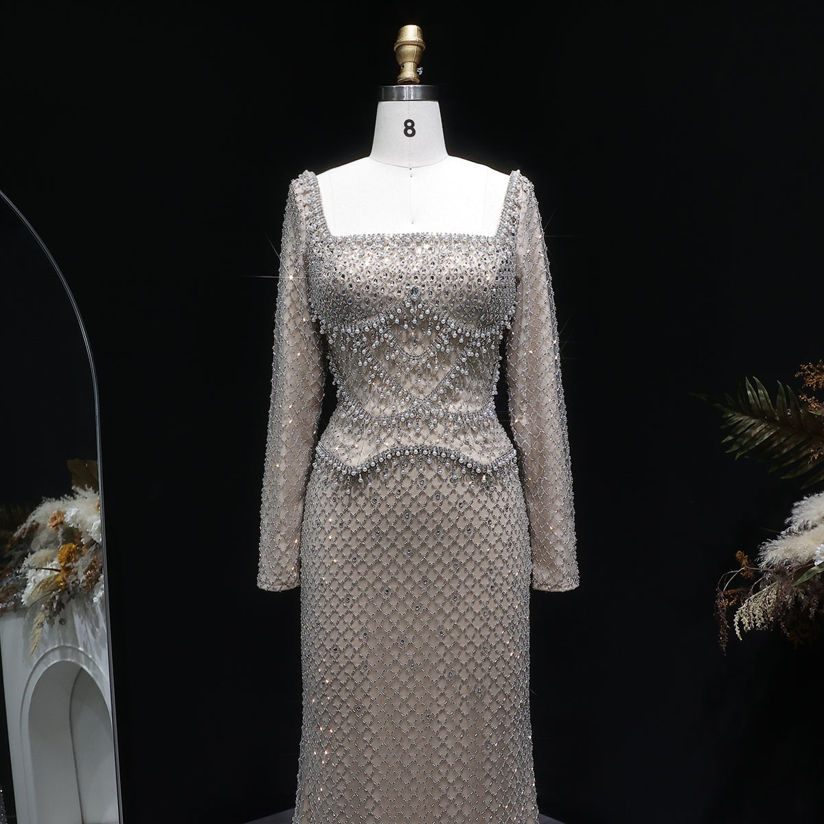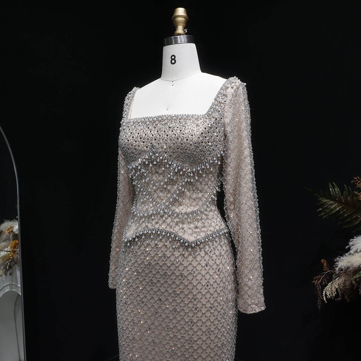 Luxuriöses Dubai Graues Kristall-Abendkleid mit langen Ärmeln SS633