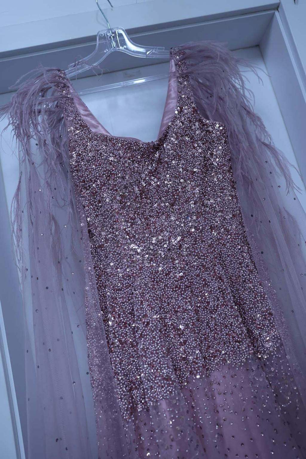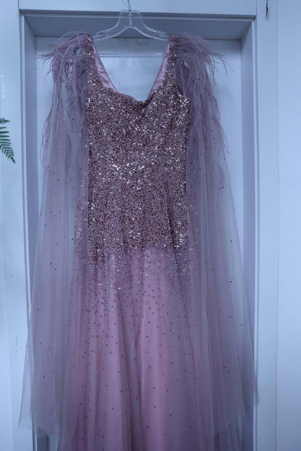 Luxuriöses rosa Abendkleid mit Federn und Cape-Ärmeln SS406