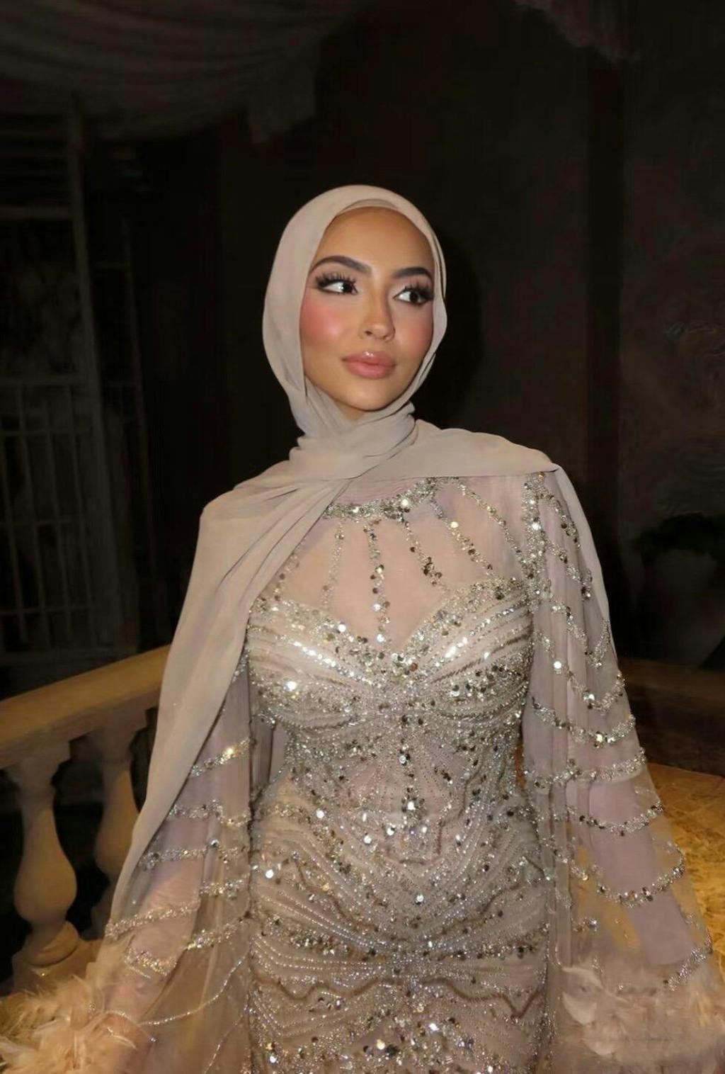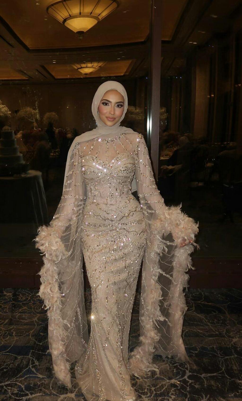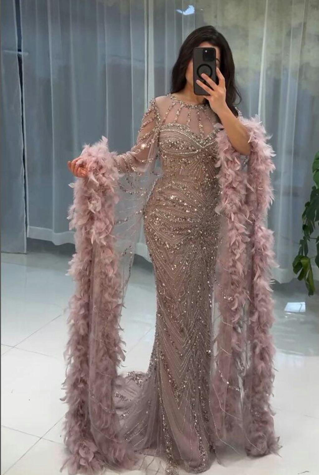 Luxury Beaded Evening Dress with Feather Cape Sleeves SS082