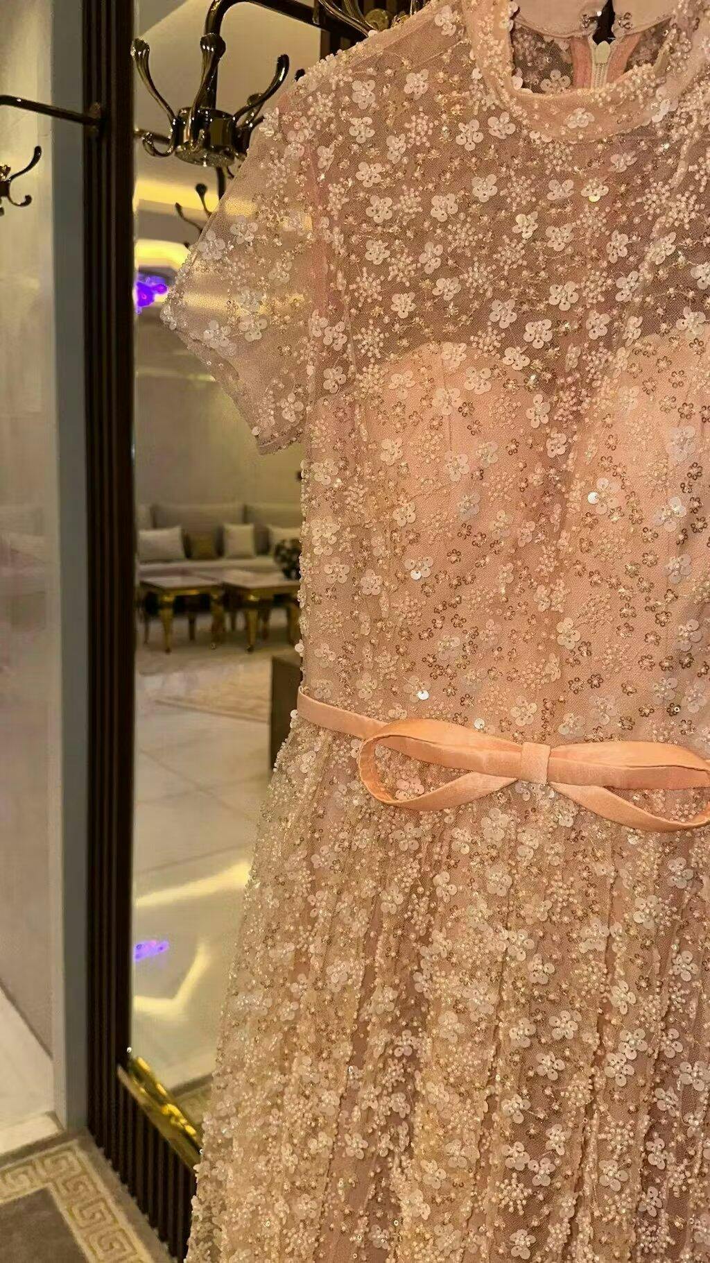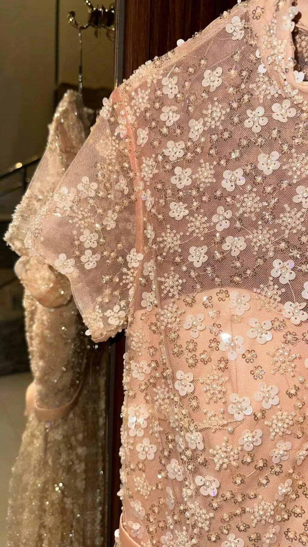 Elevate your evening elegance with this Luxury Peach Beaded Evening Dress, adorned with delicate floral embellishments. Crafted to highlight your silhouette, its intricate beadwork and soft peach hue create a refined and graceful look perfect for special occasions. This dress combines timeless sophistication with subtle artistry, ensuring you stand out with understated charm.