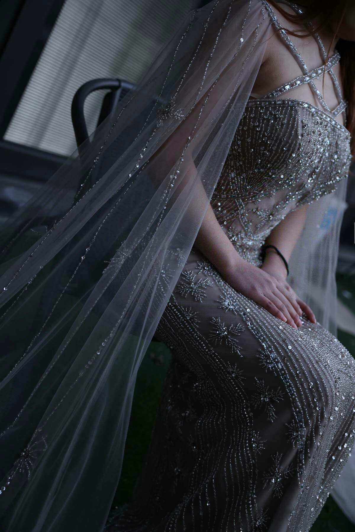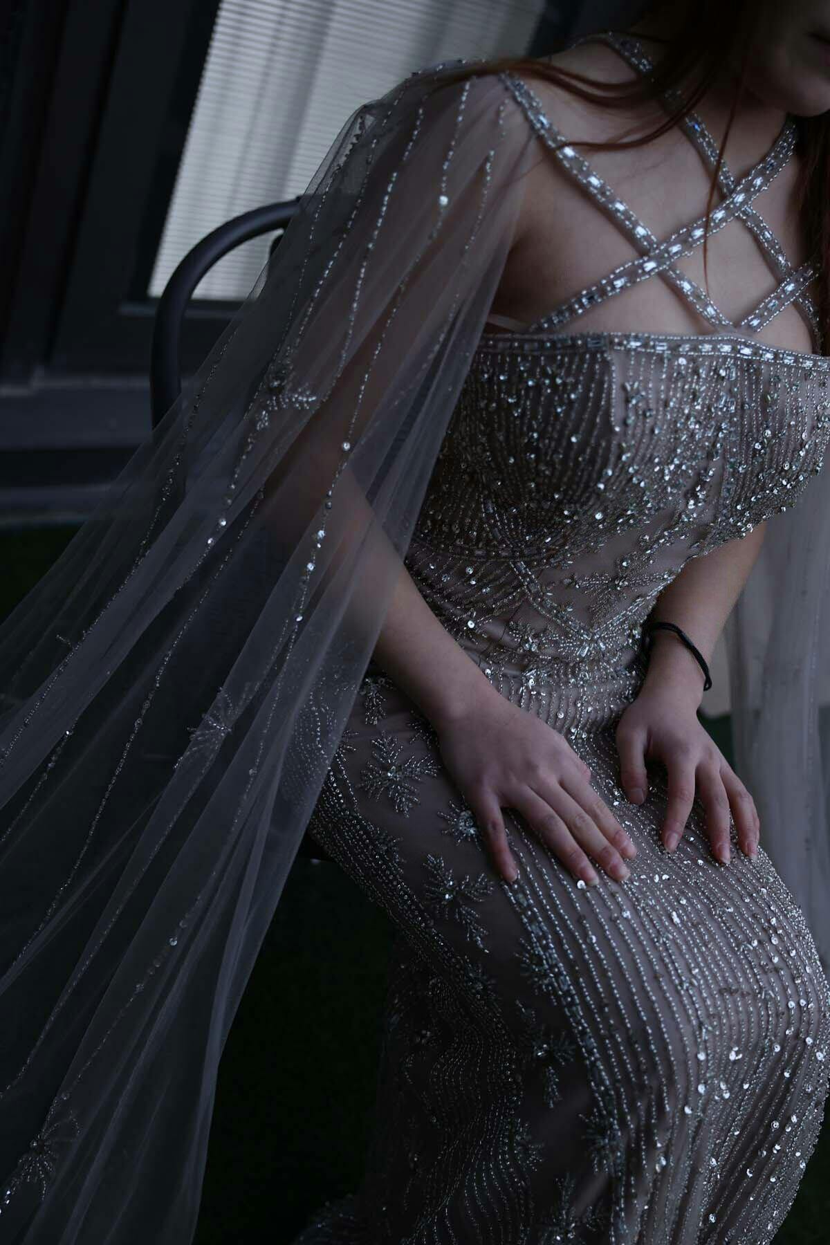 Vestido de noche de lujo con mangas estilo capa en color aguamarina, cruzado, SS391