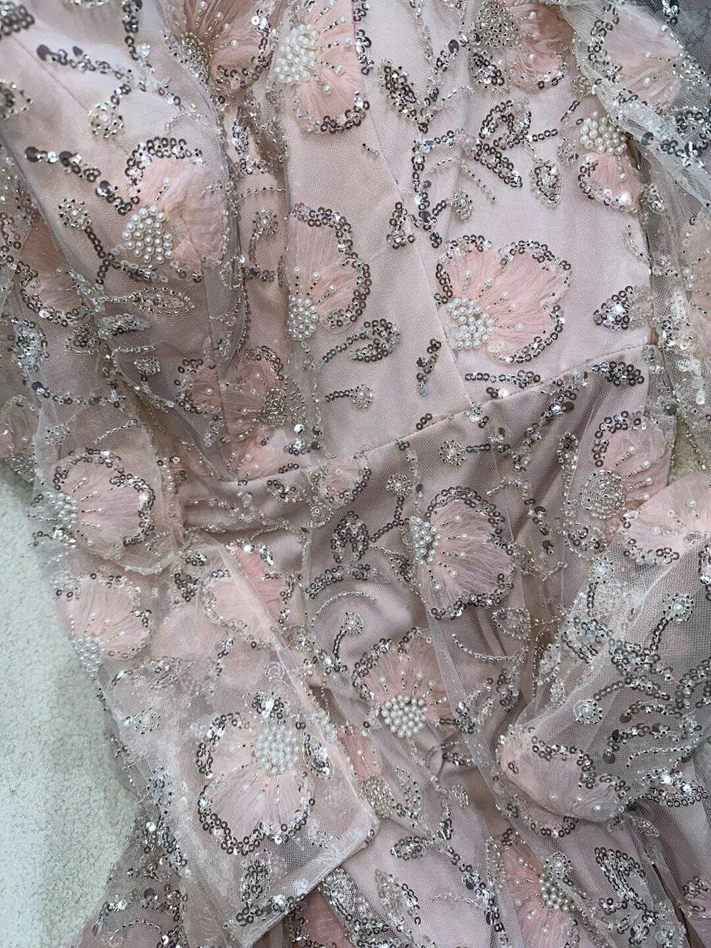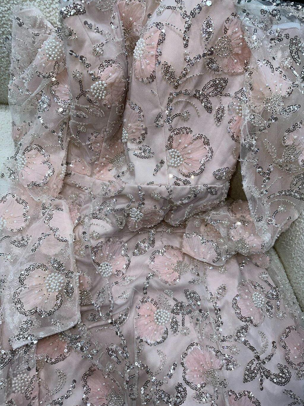 This elegant pink evening dress features delicate long sleeves adorned with intricate beadwork and embroidery, creating a refined and graceful silhouette. Perfect for formal occasions, its sophisticated design enhances your presence with subtle shimmer and timeless style.