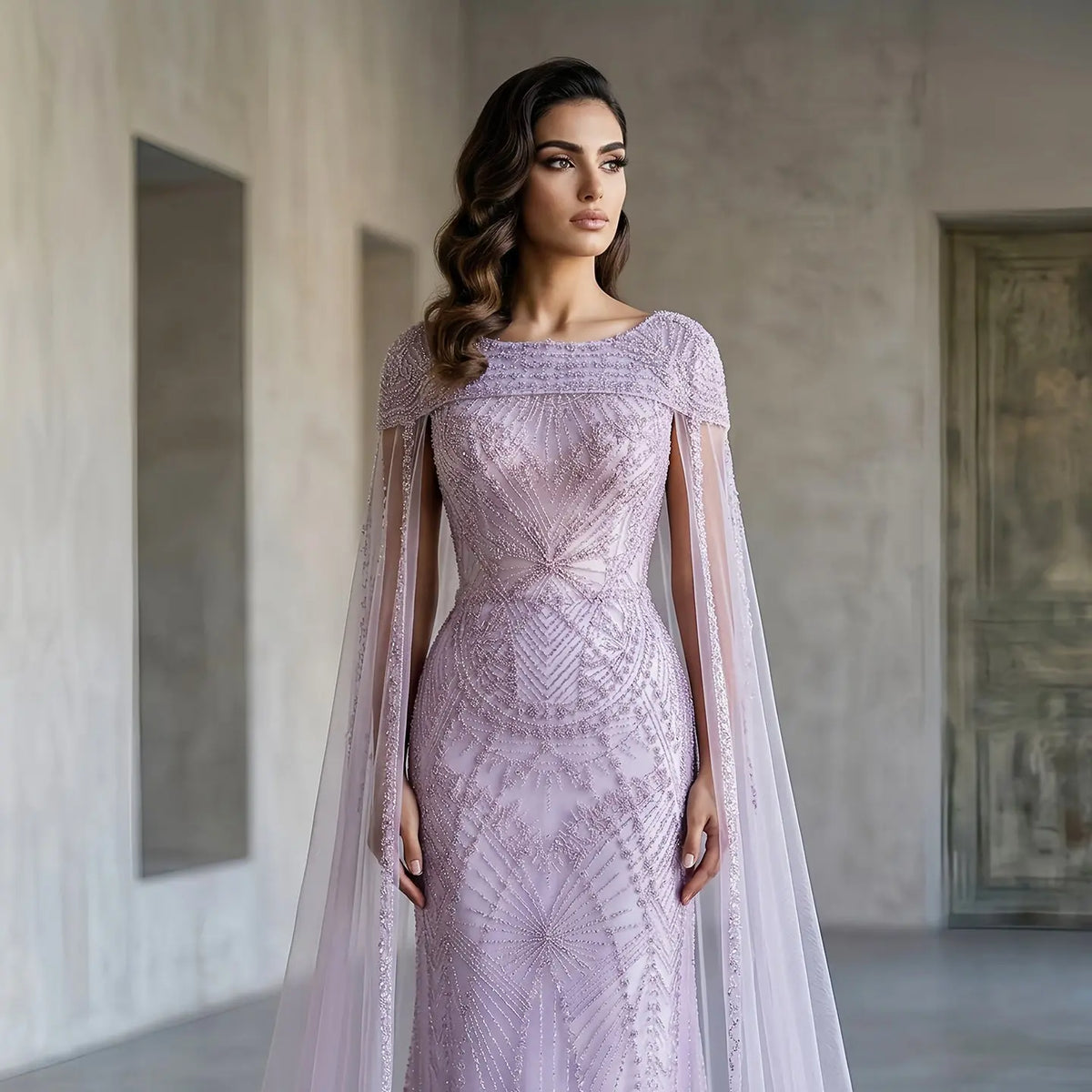 Elevate your evening elegance with this stunning lilac beaded tulle gown. Intricate beadwork adorns the bodice and skirt, creating a luminous, sophisticated silhouette perfect for galas, weddings, and formal celebrations. The dramatic cape sleeves add a touch of theatrical glamour while maintaining graceful movement. Crafted from premium tulle with delicate beading throughout, this dress combines timeless femininity with modern design. The flowing skirt ensures comfort and confidence as you make your grand entrance. A showstopping choice for anyone seeking refined luxury and unforgettable style.