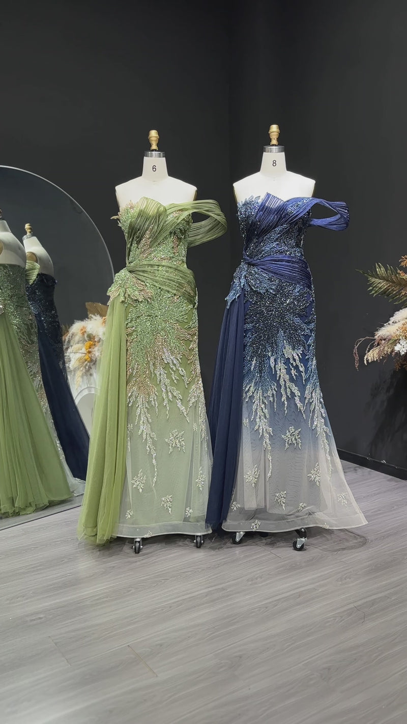 Embrace timeless elegance in this enchanting mermaid evening dress. The romantic gradient green palette flows seamlessly from soft sage to deeper emerald, creating a mesmerizing ombre effect. Delicate beading adorns the fitted bodice, catching light with every movement, while the draped silhouette hugs your curves gracefully. The dramatic overskirt adds dimension and sophistication, perfect for making a statement at galas, weddings, or formal celebrations. Crafted for the modern bride or guest who desires luxury and romance in one stunning piece.