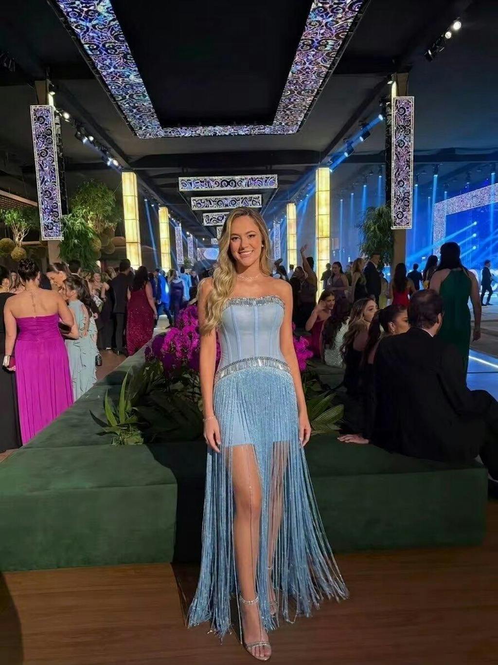 This blue fringe dress is stunning. The crystals sparkle beautifully under the lights. Perfect for evening parties.