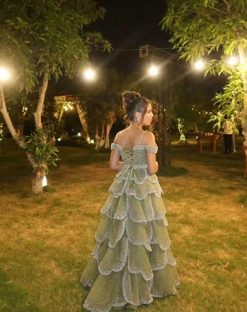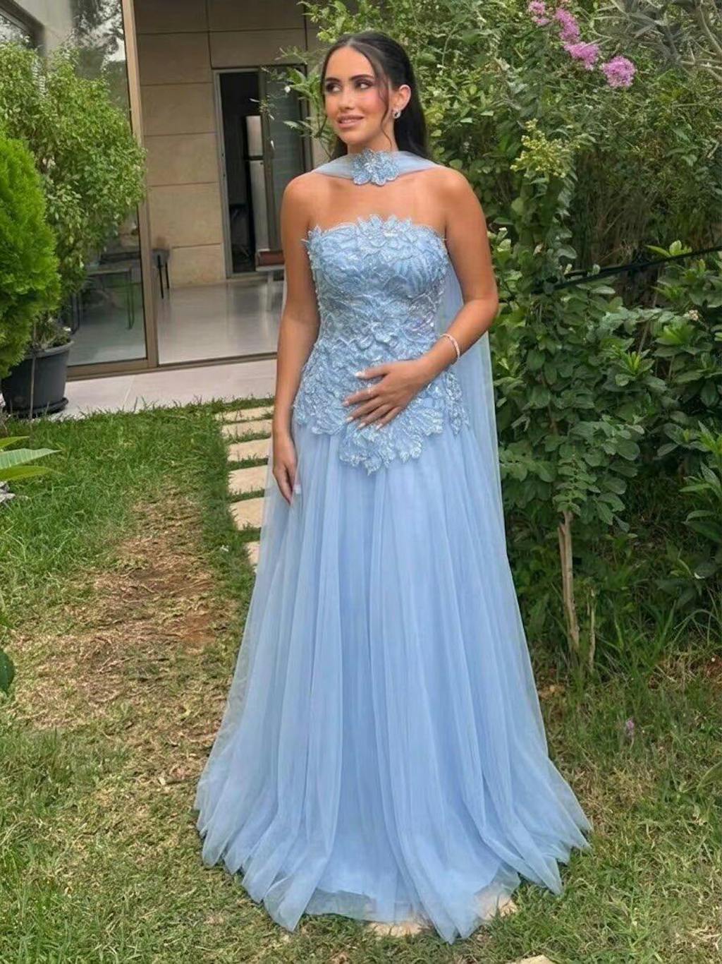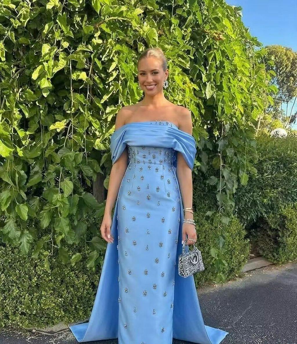 Blue dress looks elegant, off-shoulder design is classy, crystal details sparkle beautifully, very luxurious overall.