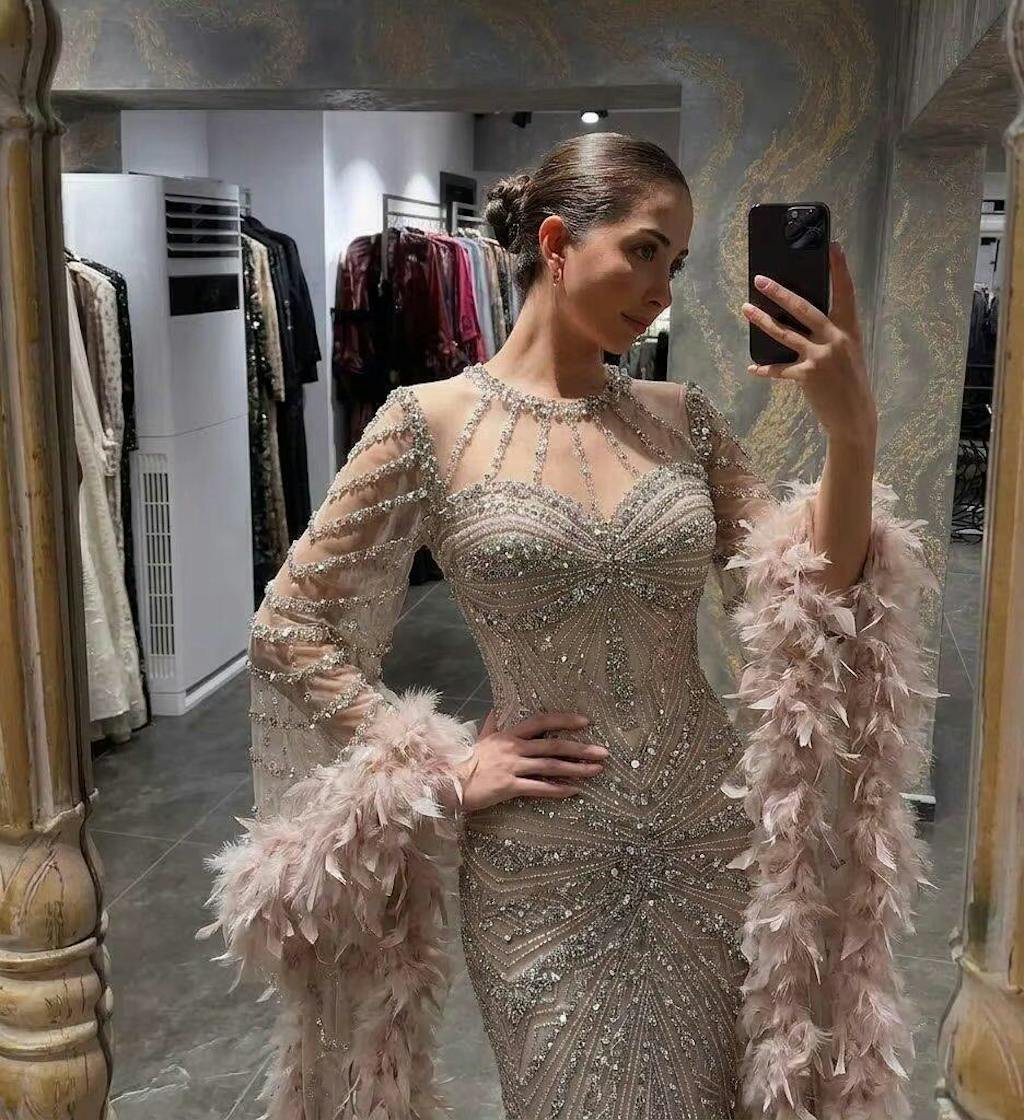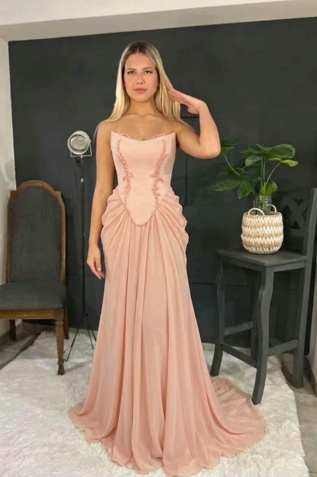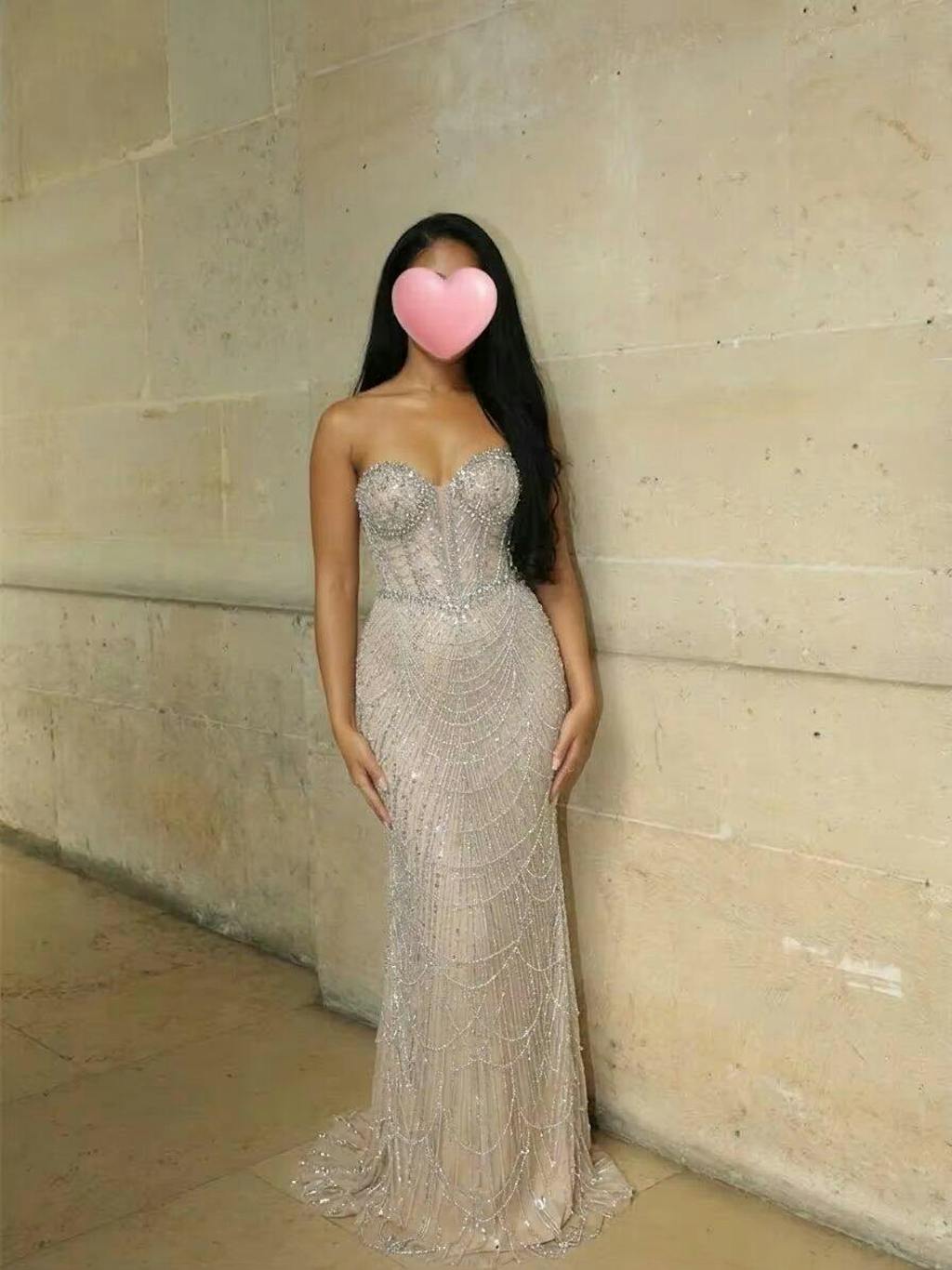 Nude evening dress looks very elegant, crystal details sparkle beautifully. Feels very refined when worn.