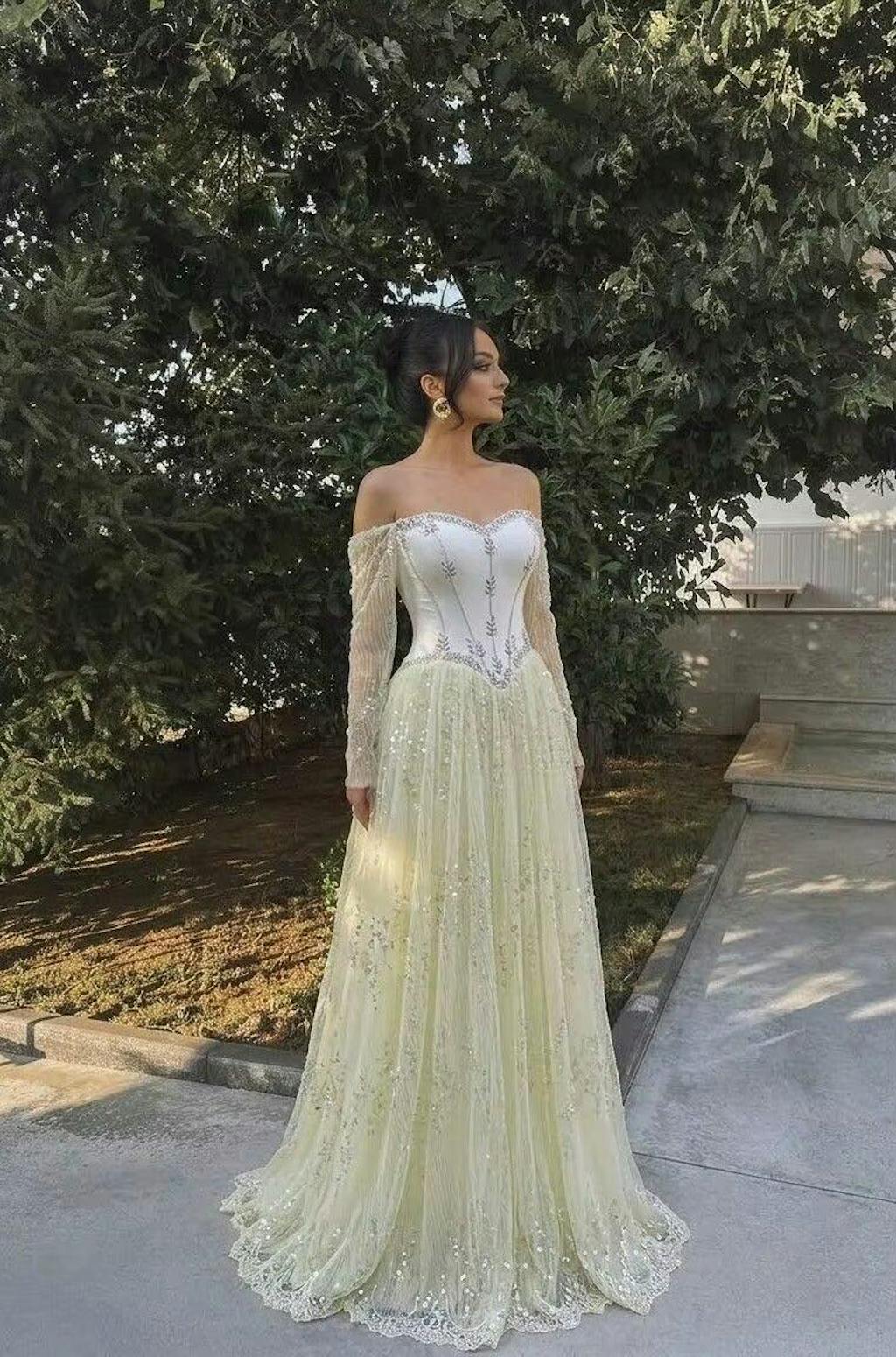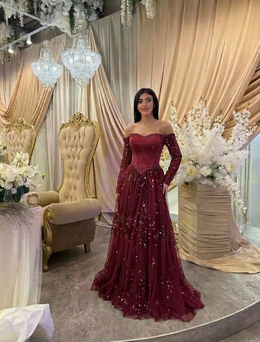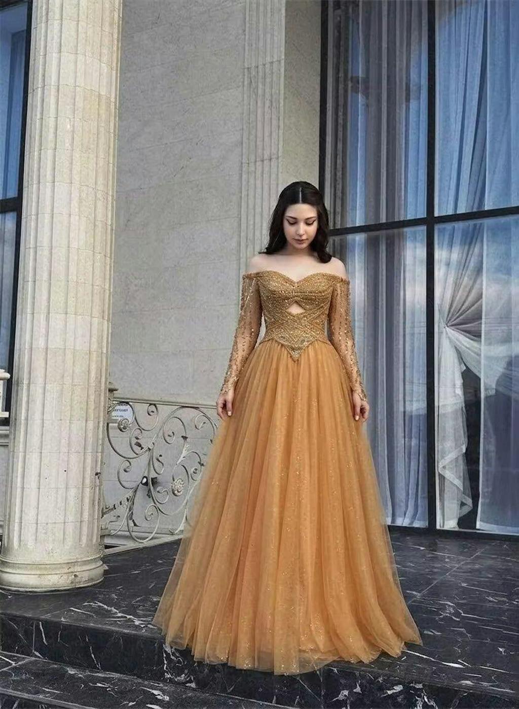Overall luxurious feel, beading sparkles, off-shoulder long sleeve design is unique. Looks amazing in photos.
