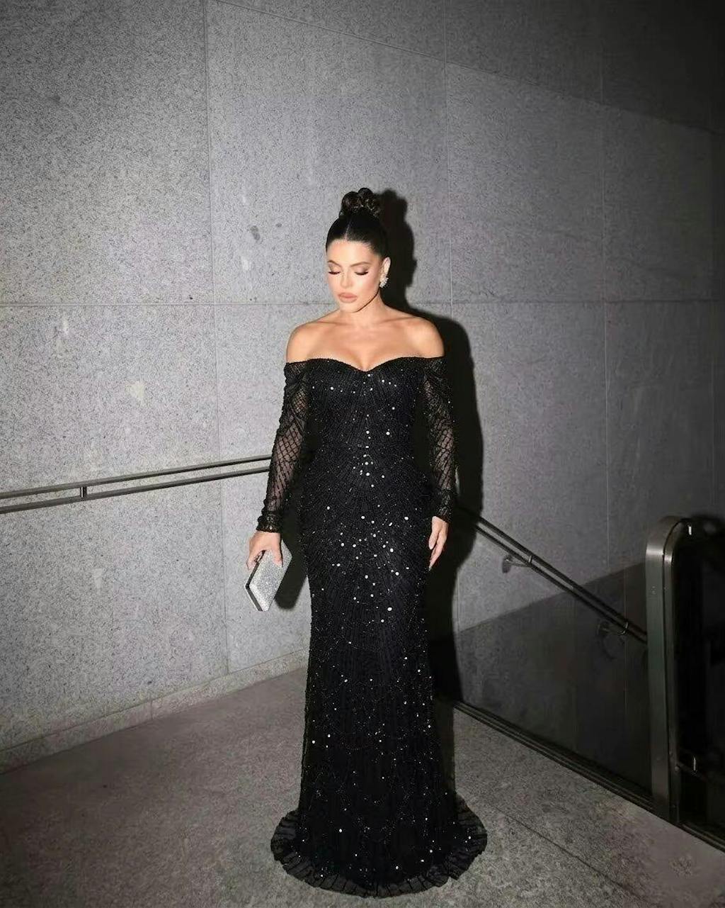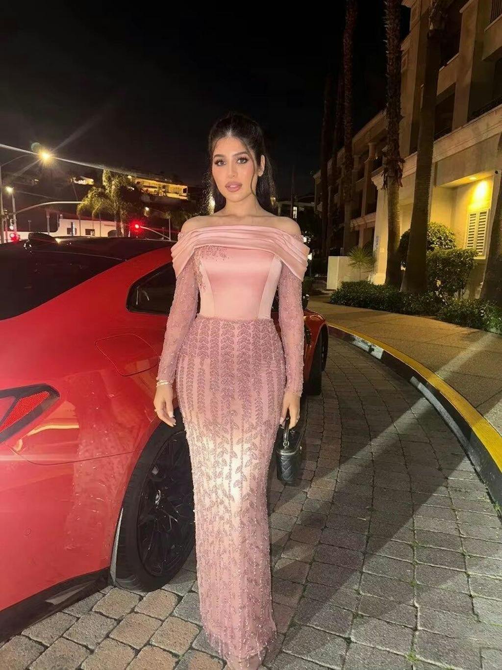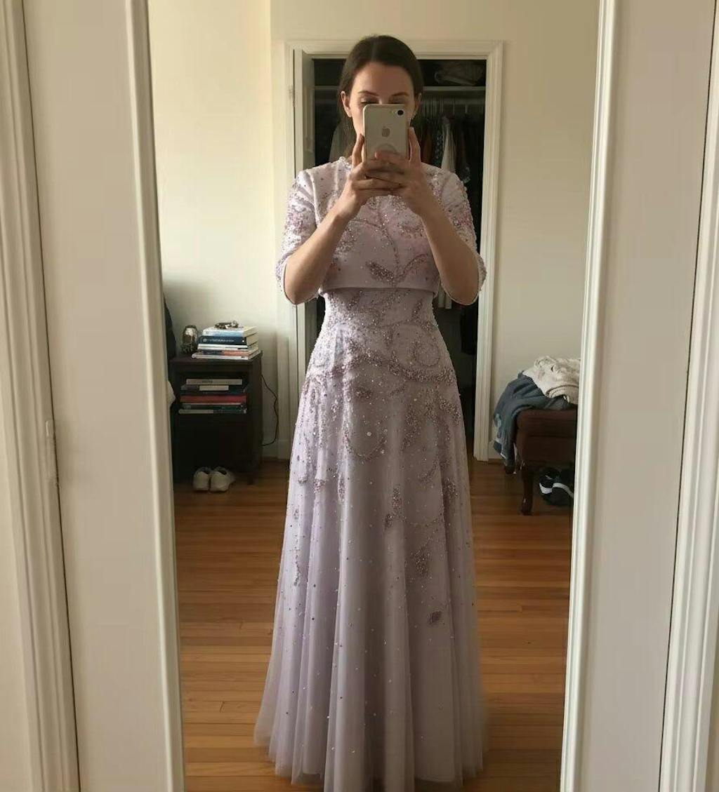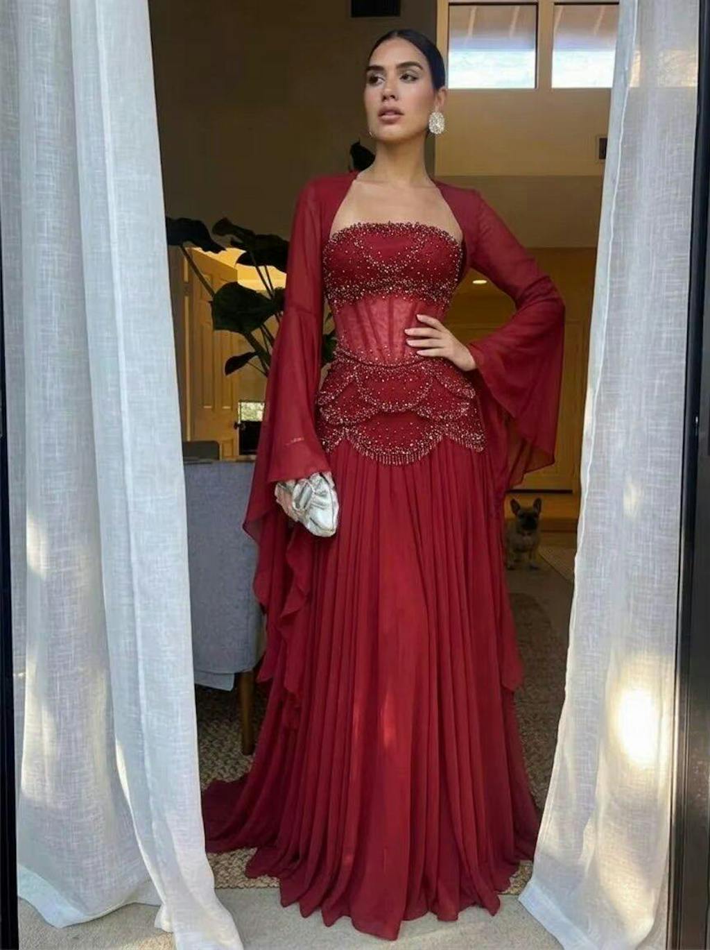 Overall luxurious feel, beading sparkles, off-shoulder long sleeve design is unique. Looks amazing in photos.